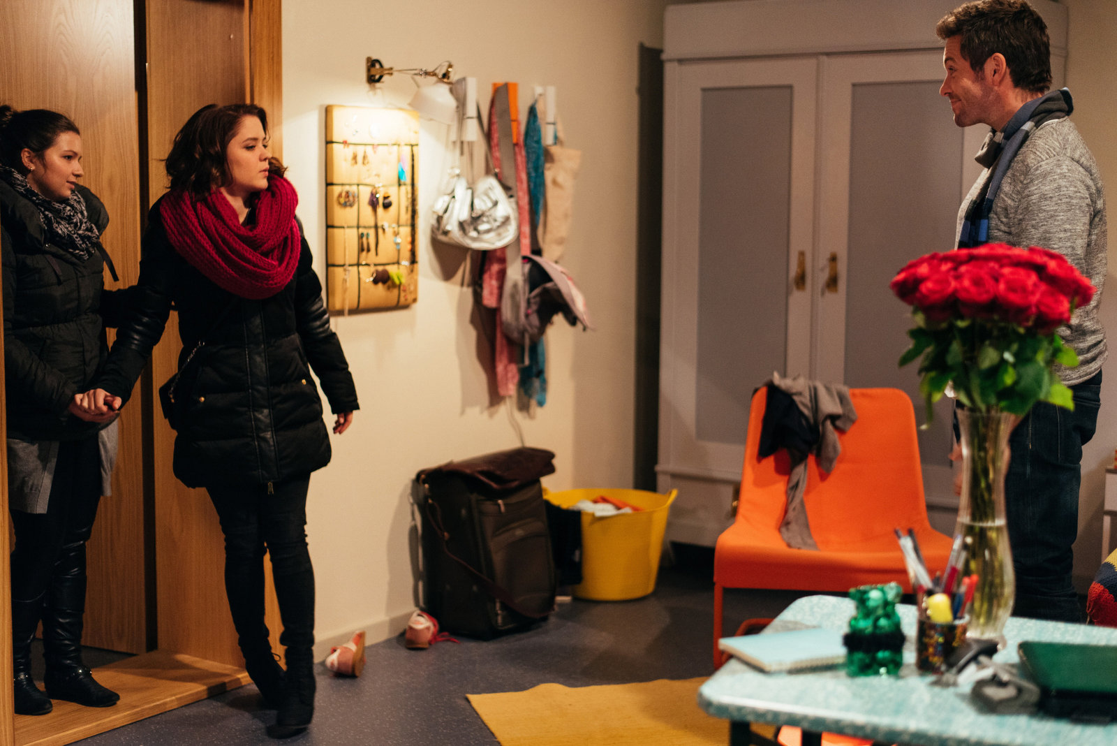 Tag der LiebeAls Nelly die betrunkene Kathi nach Hause bringt, überrascht Nik sie mit einem Blumenstrauß. Von links: Nelly (KLD), Katharina Benninger (Carina Dengler) und Niklas Wenger (Jan Hartmann).Bild: © BR/Nadya Jakobs