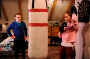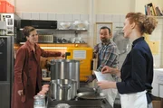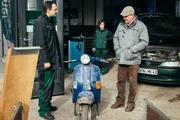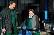 Heimliche HilfeMike erlaubt Toni, die Werkstatt für die Reparatur des Rollers zu nutzen. Von links: Mike Preissinger (Harry Blank), Antonia Sturm (Jessica Lenz) und KLD.Bild: © BR/Constantin Television GmbH/Nadya Jakobs