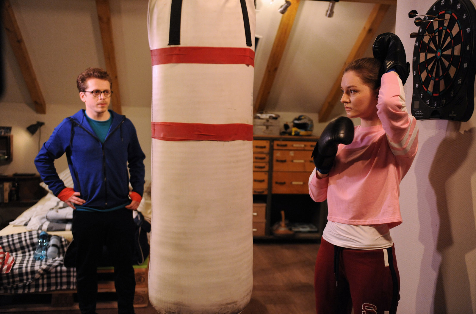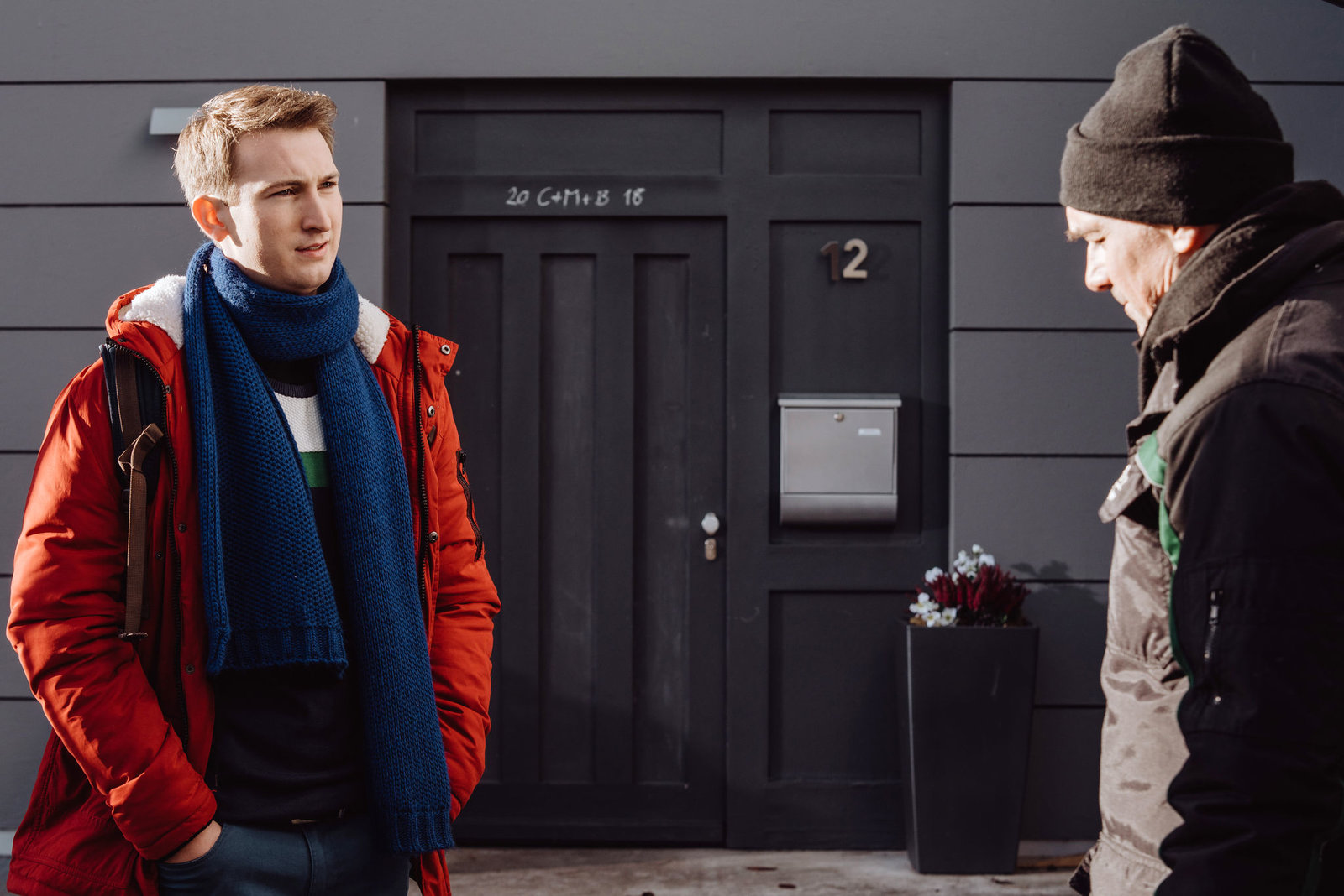 Liebesglück und KaterstimmungPauli übernimmt Philipps ehemaligen Job als Flyer-Austräger. Von links: Philipp (Philip Schneider) und Pauli (Dennis Hofmuth).Bild: © BR/Marco Orlando Pichler