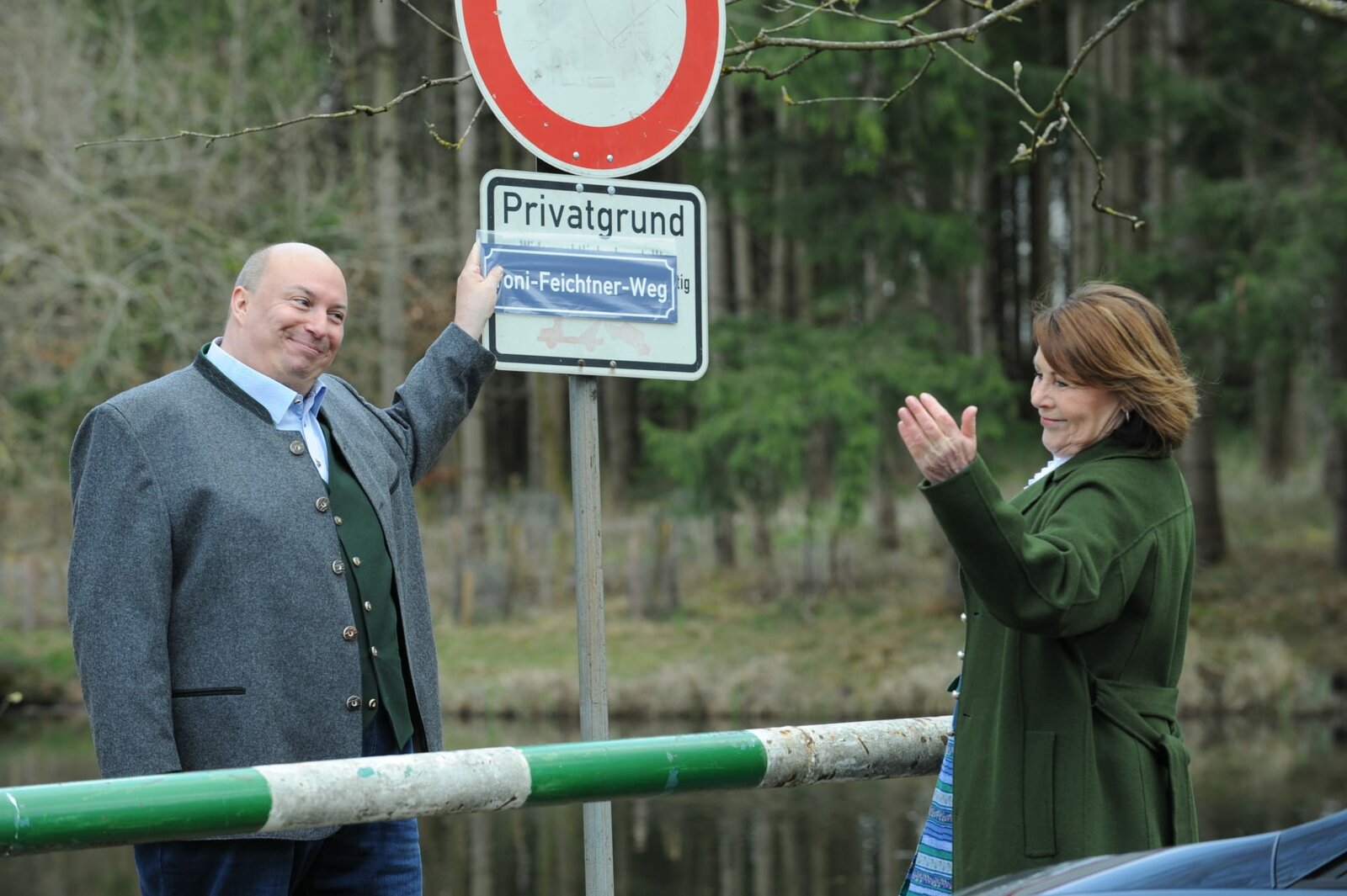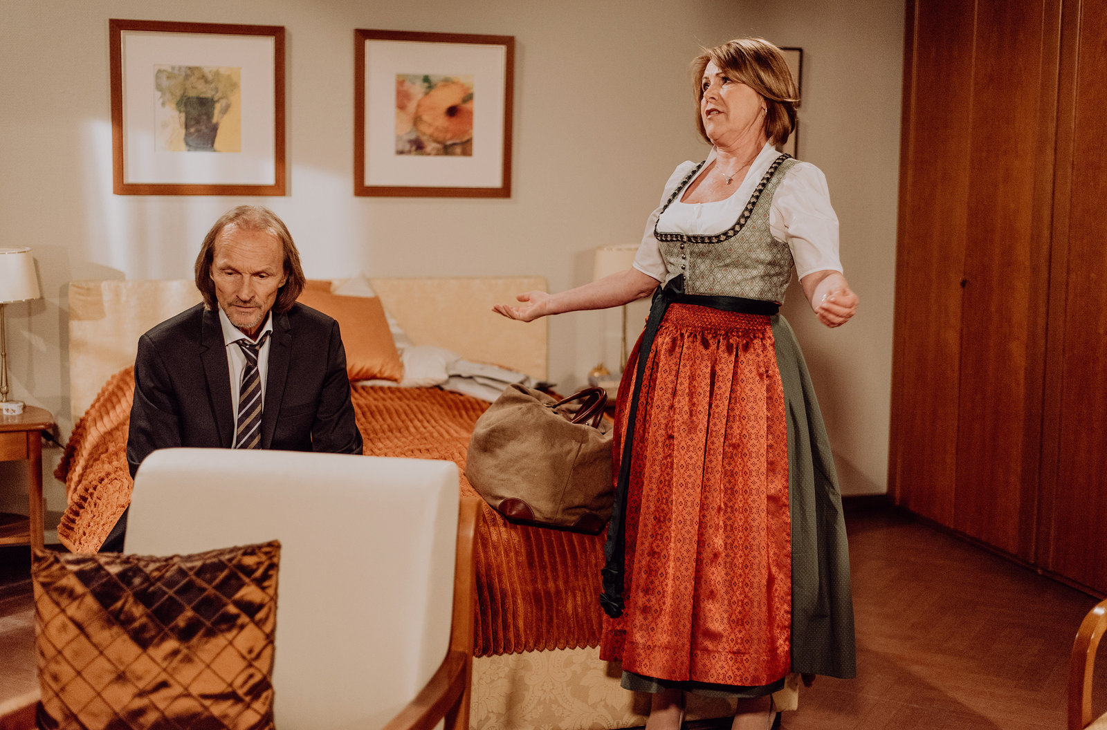 Harte VerhandlungenRosi ist fassungslos, als Sascha den Schlüssel aus dem Fenster wirft. Von links: Alexander "Sascha" Wagenbauer (Eisi Gulp) und Rosi Kirchleitner (Brigitte Walbrun).Bild: © BR/Nadya Jakobs