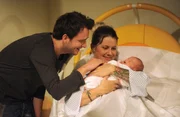 Der Rap-o-thekerFlorian und Anna genießen die ersten Momente mit ihrer Tochter. Von Links: Florian Brunner (Tommy Schwimmer), Anna (Pia Tillmann) und Viktoria (KLD).Bild: © BR/Marco Orlando Pichler