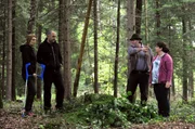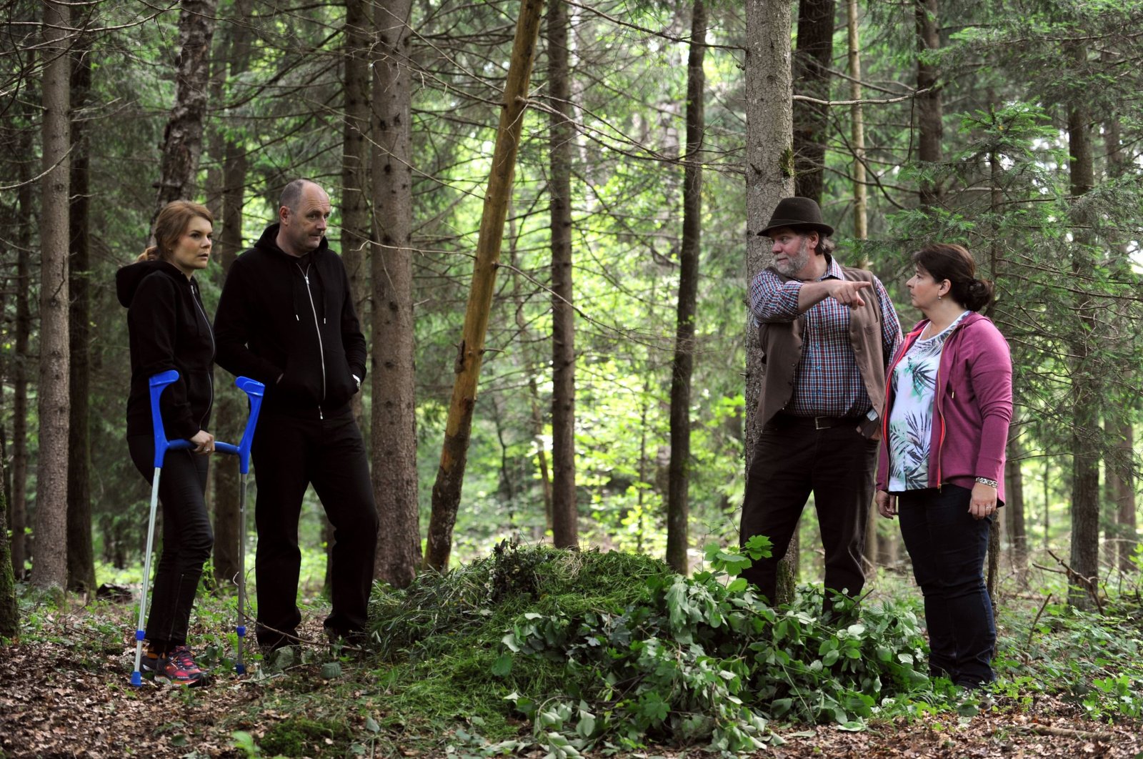 Welches Schweinderl hätten's gern?Stadlbauer ist erzürnt, dass Fremde ihren Abfall in Schattenhofers Wald abgeladen haben. Von links: Uschi Kirchleitner (Silke Popp), Hubert Kirchleitner (Bernhard Ulrich), Benedikt Stadlbauer (Andreas Geiss) und Monika Vogl (Christine Reimer).Bild: © BR/Marco Orlando Pichler