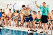 Geheime GefühleAls Felix beim Tauchen zögert, will Lehrer Gilg ihm mit einem gutgemeinten Schubs auf die Sprünge helfen. Von links: KLD, Felix Kramer (Shayan Hartmann) und Lehrer Gilg (KLD).Bild: © BR/Nadya Jakobs