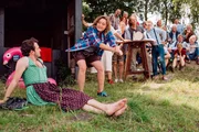 Ganz neue TönePauli (Dennis Hofmuth) verliert vor Schreck sein Taschenmesser, als er in der Schwitzhütte nackte Landfrauen sieht.Bild: © BR/Nadja Jakobs