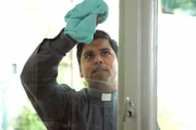 Pfarrer Burman (Daniel Popat) versucht, das Fahrradöl wieder von der Kioskscheibe zu putzen.Bild: © Marco Orlando Pichler / BR / BR/Marco Orlando Pichler