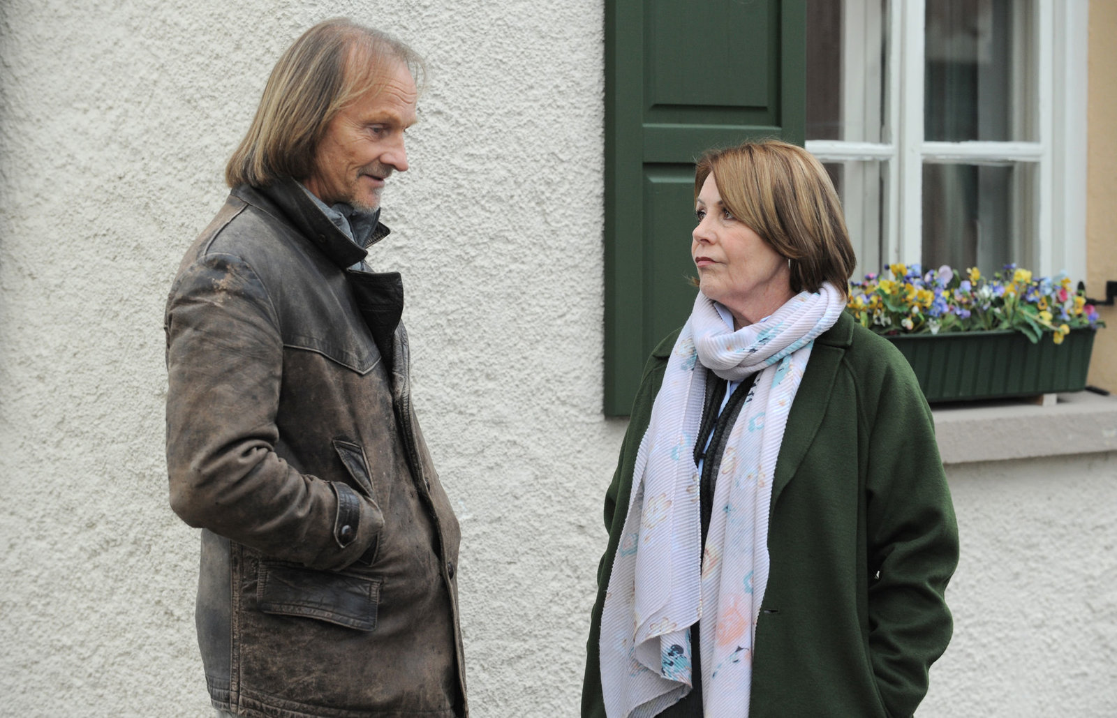 Die Glocken GottesRosi und Sascha sind wegen Saschas „Presserummel“ um sein Einrücken ins Gefängnis uneins. Von links: Alexander "Sascha" Wagenbauer (Eisi Gulp) und Rosi Kirchleitner (Brigitte Walbrun).Bild: © BR/Marco Orlando Pichler