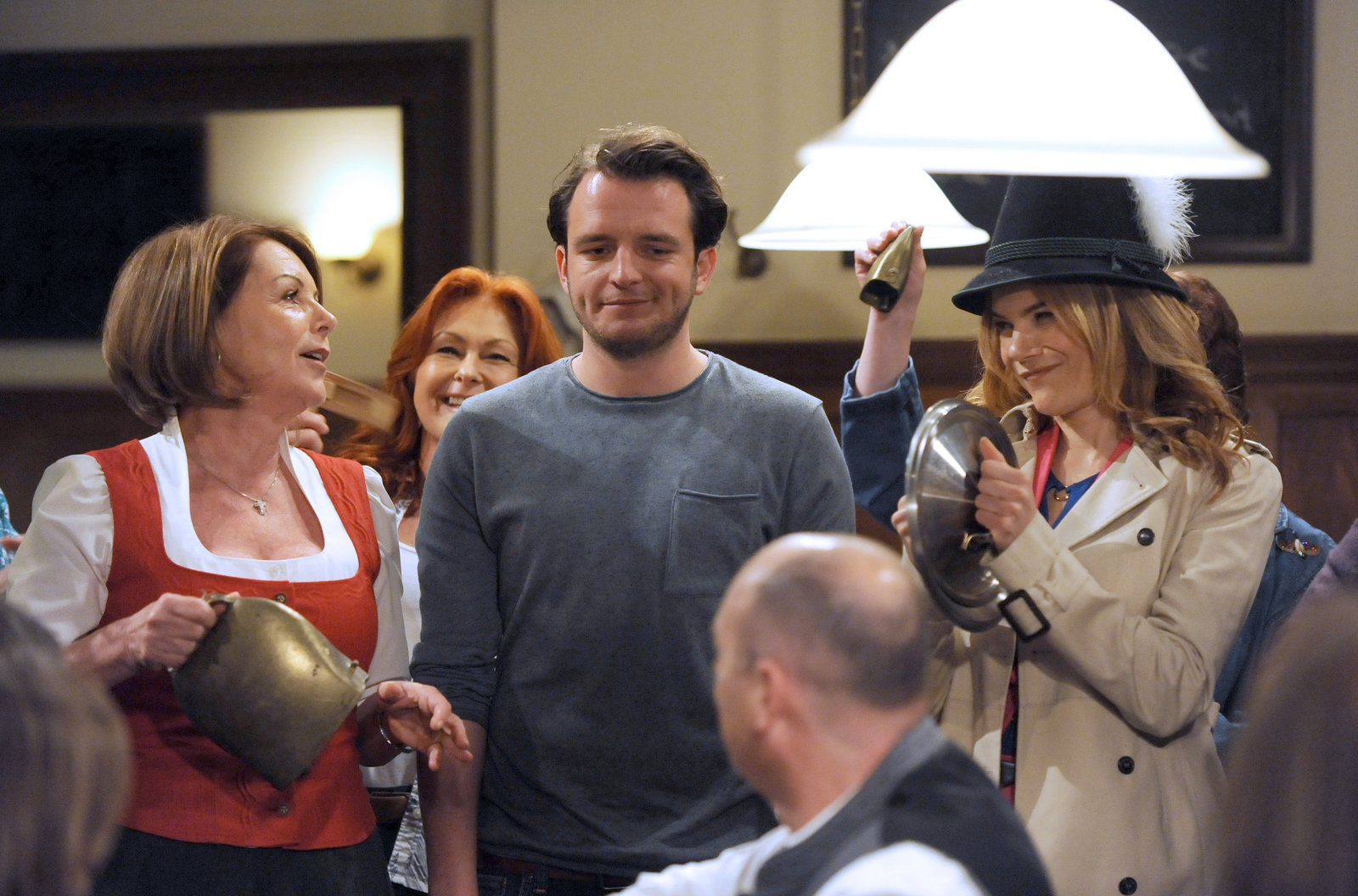 Angst vor dem DahoamFanny bekommt genau das, was sie sich gewünscht hat. Von links: Monika Vogl (Christine Reimer), Mike Preissinger (Harry Blank), Trixi Preissinger (Doreen Dietel), Annalena Brunner (Heidrun Gärtner), Fanny Lechner (Katrin Lux) und Gregor Brunner (Holger M. Wilhelm).Bild: © BR/Nadya Jakobs