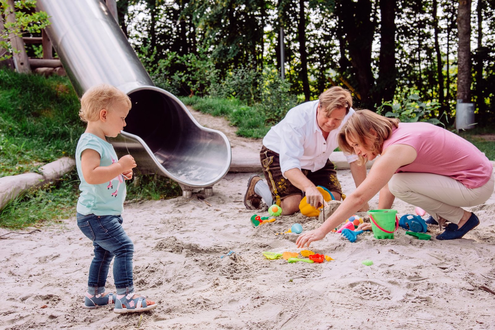 VerlockungenVeronika und Max machen mit Enkelin Vicky einen Ausflug auf den Spielplatz. Von links: Viktoria Reimann (Lisa Angerer), Max Brunner (Michael A. Grimm) und Veronika Brunner (Senta Auth).Bild: © BR/Nadya Jakobs
