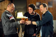 Väter unter sichFlori und die anderen Männer sind gar nicht so unglücklich, als Organisator Bamberger ausfällt. Von links: Hubert Kirchleitner (Bernhard Ulrich), Florian Brunner (Tommy Schwimmer) und Gregor Brunner (Holger Matthias Wilhelm).Bild: © BR/Marco Orlando Pichler