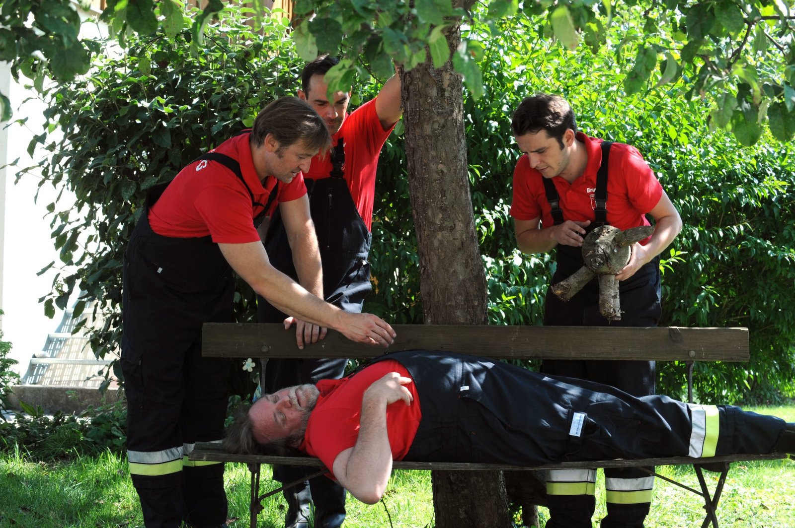 Rachedurst in RachertingDie Feuerwehrler wollen Stadlbauer für den erneuten Wettbewerb gegen Racherting gewinnen. Von links: Gregor Brunner (Holger M. Wilhelm), Mike Preissinger (Harry Blank), Florian Brunner (Tommy Schwimmer) und Benedikt Stadlbauer (Andreas Geiss).Bild: © BR/Marco Orlando Pichler