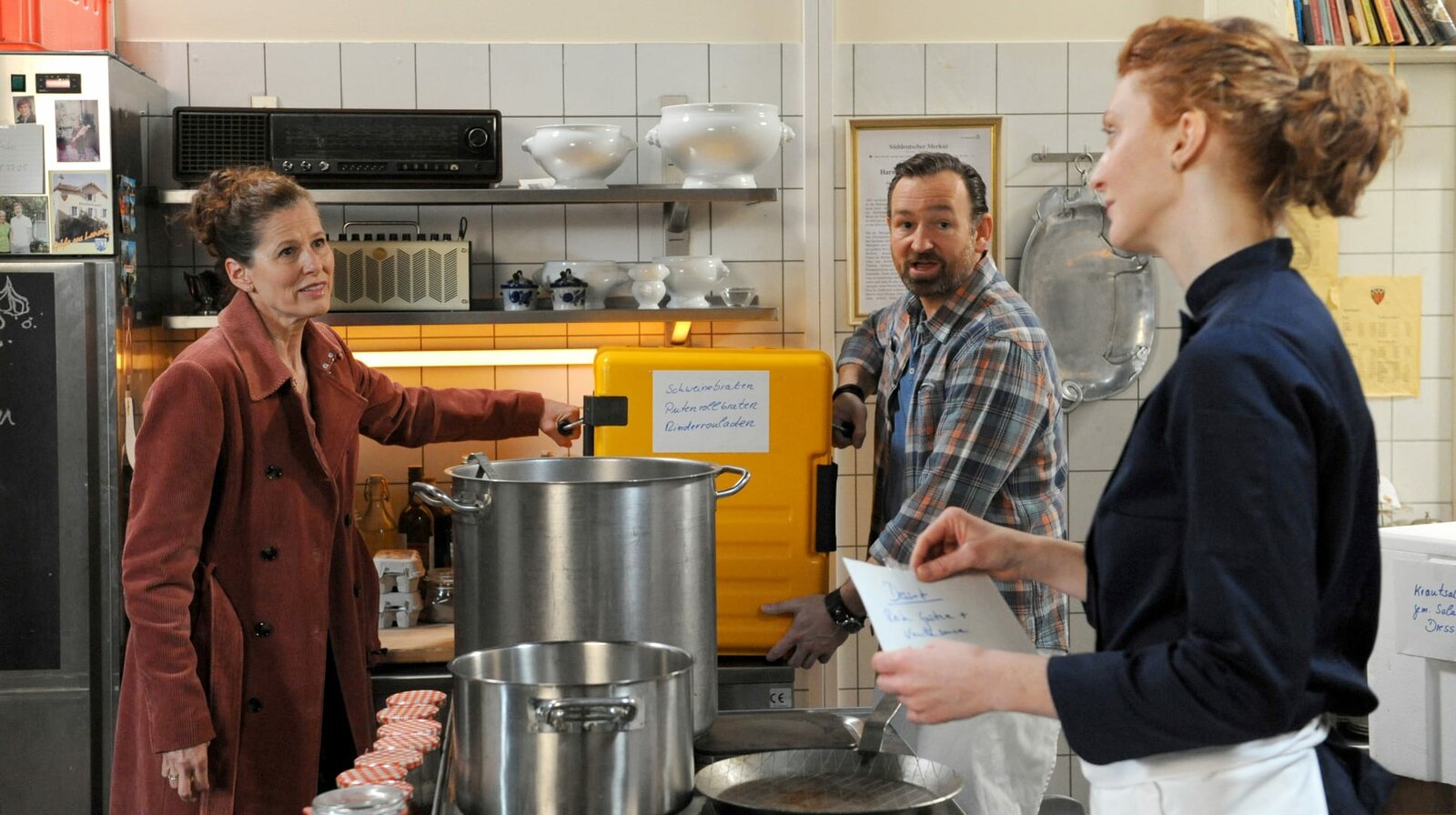 Schwere KostFanny und die Elternbeiräte ziehen an einem Strang und einigen sich in Sachen Schulessen. Von links: Rektorin (Christine Lankes), Fanny Lechner (Katrin Lux) und Köchin Hanni (Angelika Sedlmeier).Bild: © BR/Marco Orlando Pichler
