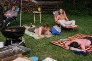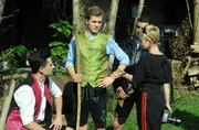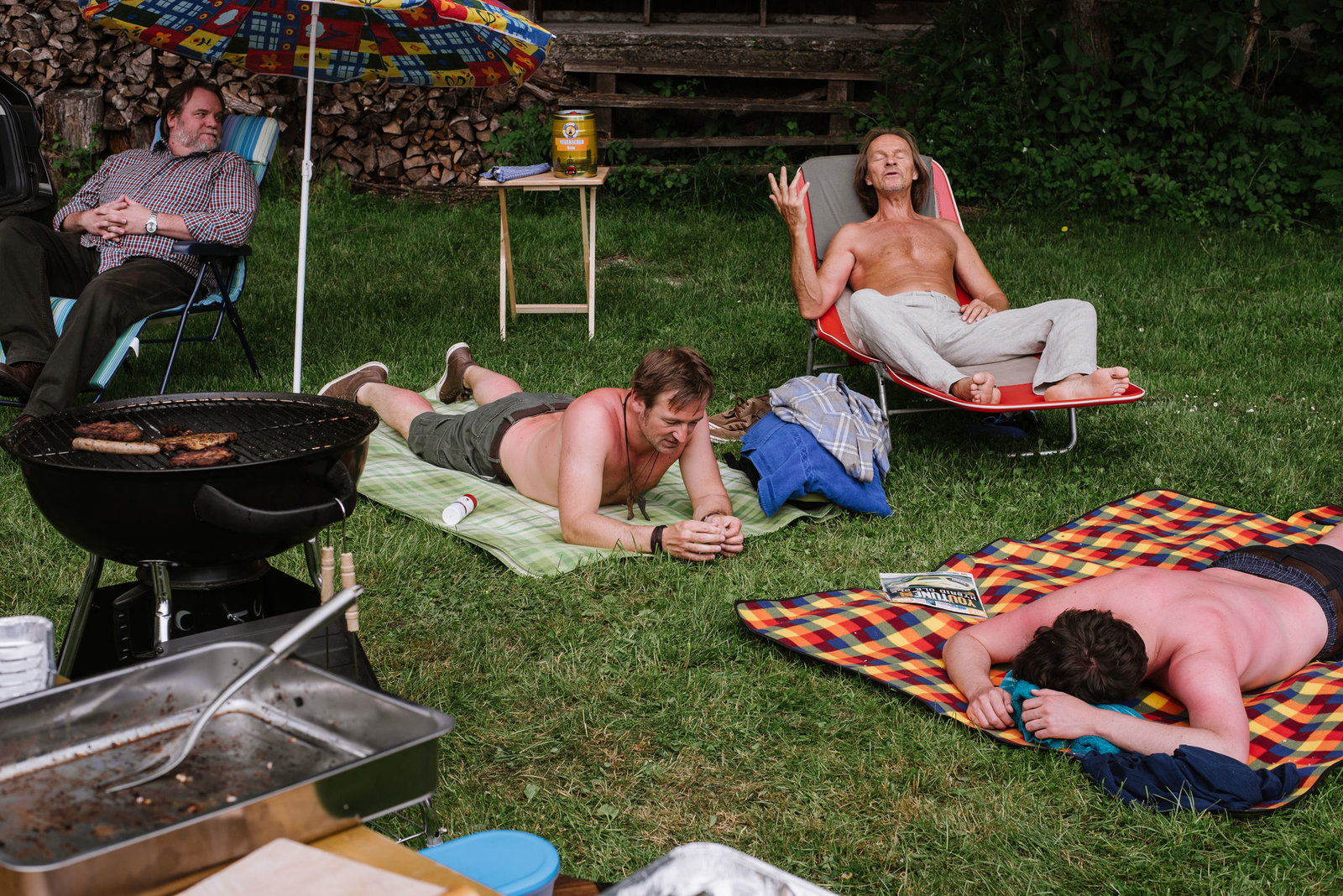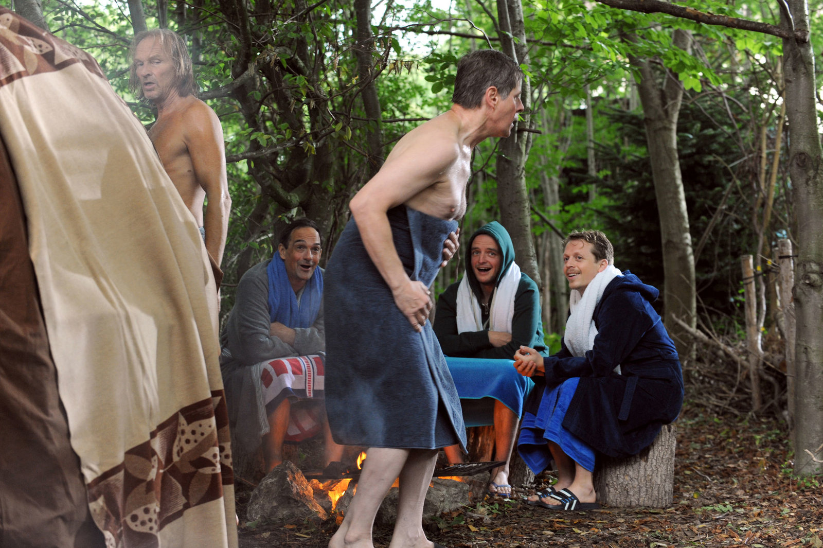 Die Lansinger SchamanenMike, Florian und Pfarrer Brandl sitzen gemütlich, ihre Handtücher um die Hüften, in der Nähe des Lagerfeuers, relaxen und atmen dabei in vollen Zügen die frische Luft ein. Da kommen Bamberger und Sascha total schwitzend und hustend aus der Hütte gekrabbelt. Von Links: Alexander "Sascha" Wagenbauer (Eisi Gulp), Mike Preissinger (Harry Blank), Roland Bamberger (Horst Kummeth), Florian Brunner (Tommy Schwimmer) und Pfarrer Simon Brandl (Ferdinand Schmidt-Modrow).Bild: © BR/Marco Orlando Pichler