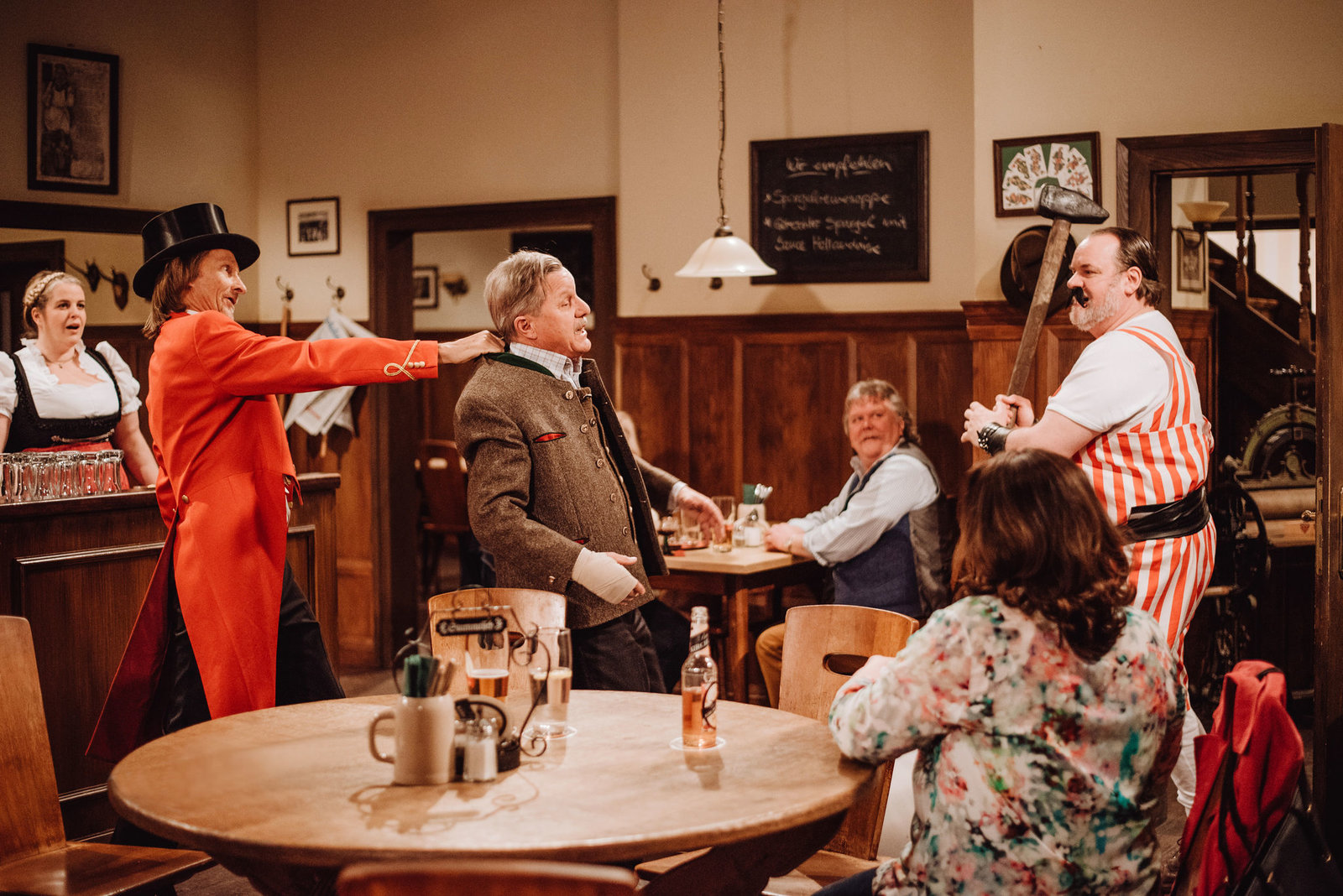 Schweigen ist GoldStadlbauer und Sascha teilen ihre Abneigung gegen Schattenhofer, indem sie gemeinsam tagträumen, wie sie Schattenhofer in die Mangel nehmen. Von links: KLD, Alexander "Sascha" Wagenbauer (Eisi Gulp), Lorenz Schattenhofer (Werner Rom), KLD, Benedikt Stadlbauer (Andreas Geiss) und Monika Vogl (Christine Reimer).Bild: © BR/Nadya Jakobs / Nadya Jakobs