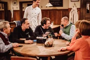Aus allen Wolken gefallenHubert ist erleichtert, als er beim Fußballquiz tatkräftige Unterstützung erhält. Von links: Michael Gerstl (Gerd Lohmeyer), Mike Preissinger (Harry Blank), Patrick Westenrieder (Lucas Bauer), Florian Brunner (Tommy Schwimmer), Hubert Kirchleitner (Bernhard Ulrich), Uschi Kirchleitner (Silke Popp), Rosi Kirchleitner (Brigitte Walbrun).Bild: © BR/Nadya Jakobs / Nadya Jakobs