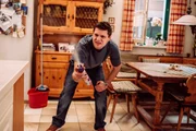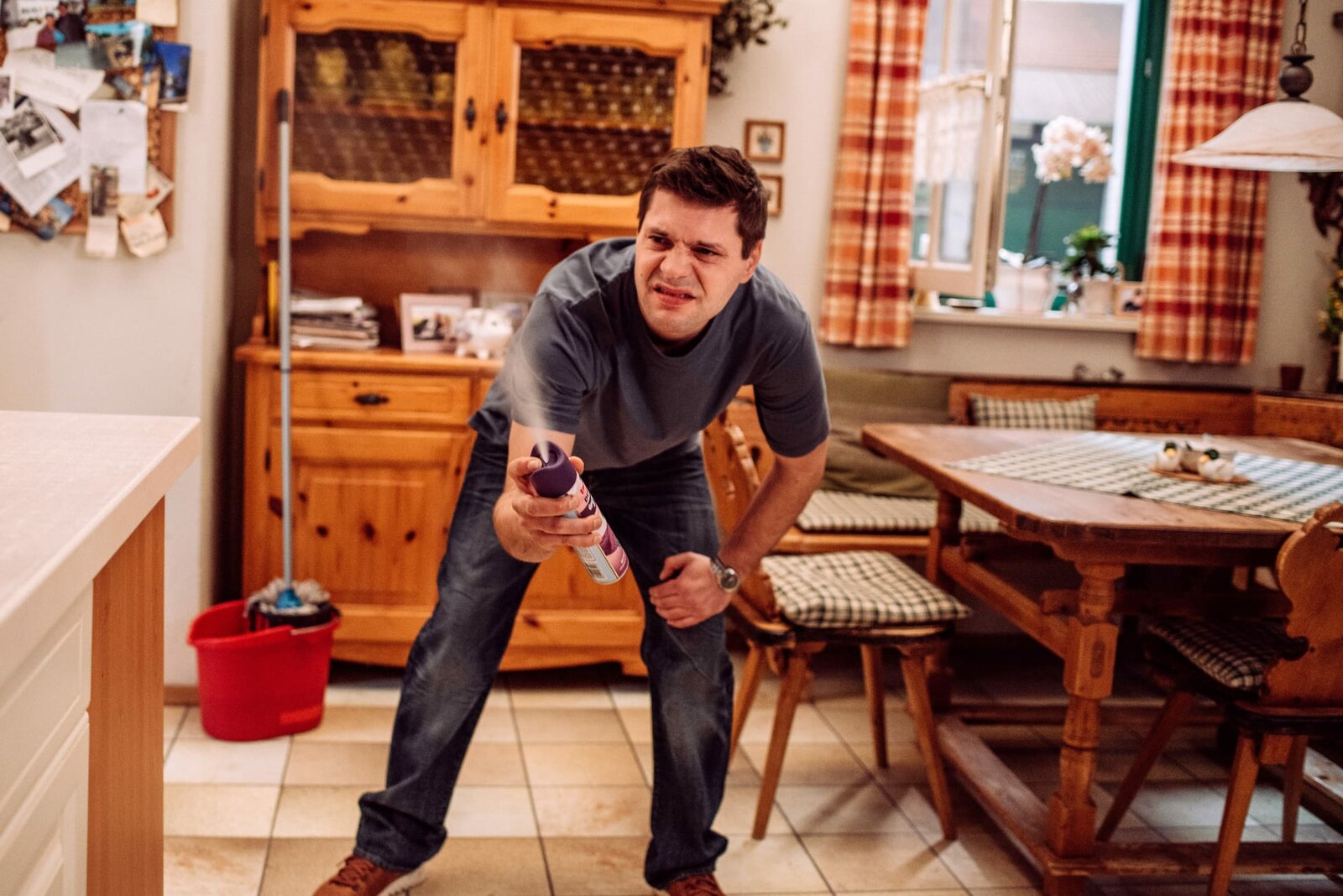 Wenn zwei sich streitenKorbinian (Marco Bretscher Coschignano) versucht mit allen Mitteln, den Gestank aus der Küche zu vertreiben.Bild: © Nadya Jakobs / BR / BR/Nadya Jakobs