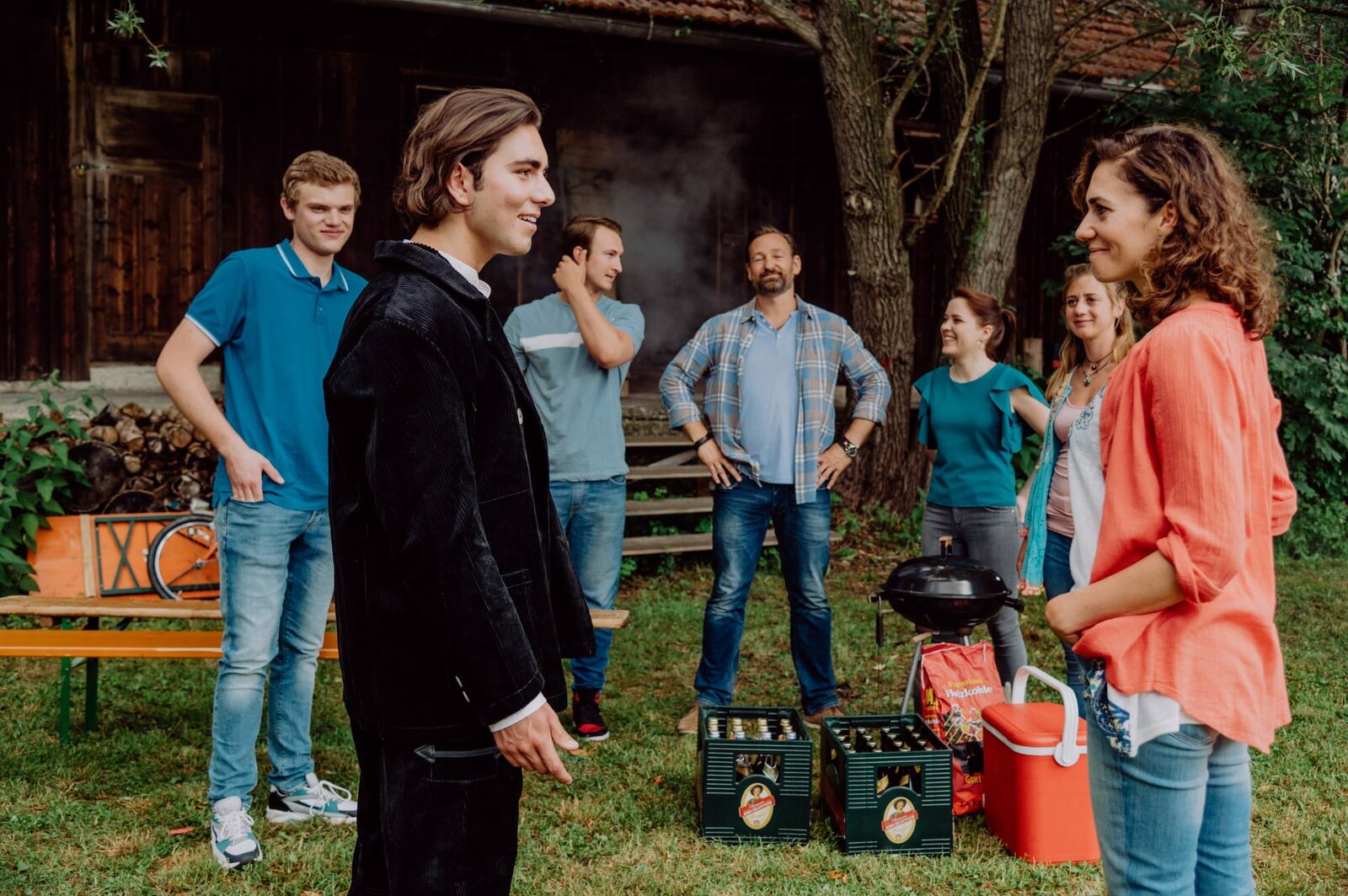 Felix' AbschiedFelix freut sich, als sich Freunde und Familie so viel Mühe um seinen Abschied gemacht haben. Von links: Philipp (Philipp Schneider, KLD), Felix (Shayan Hartmann), Christian (Jonathan Gertis), Gregor (Holger Matthias Wilhelm), Katharina (Carina Dengler), Sarah (Sophie Reiml) und Fanny (Katrin Lux).Bild: © Nadya Jakobs / BR / BR/Nadya Jakobs