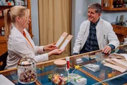 Der Pfarrer muss wegBamberger (Horst Kummeth) überrascht Vera (Sybille Waury) mit eigenen Etiketten für den neuen Heiltee.Bild: © Nadya Jakobs / BR / BR/Nadya Jakobs