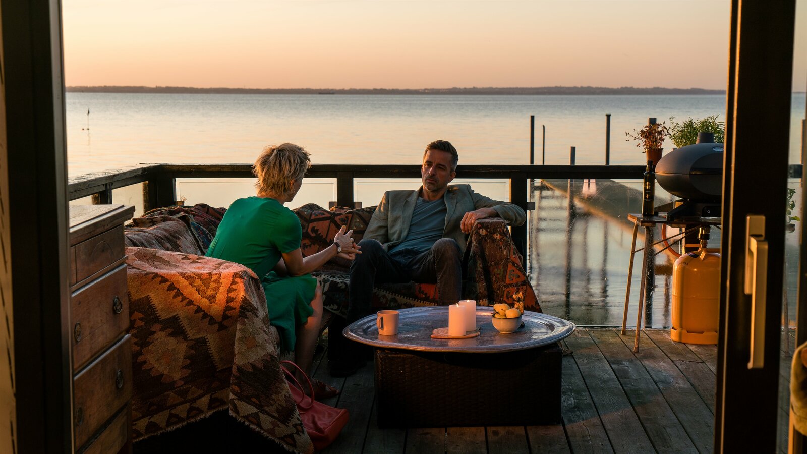 HeiratsschwindlerFlemming (André Babikian) kommt seiner alten Liebe Marianne (Laura Drasbæk) in einem Gespräch sehr nah.Bild: © ZDF und Mike Kollöffel.