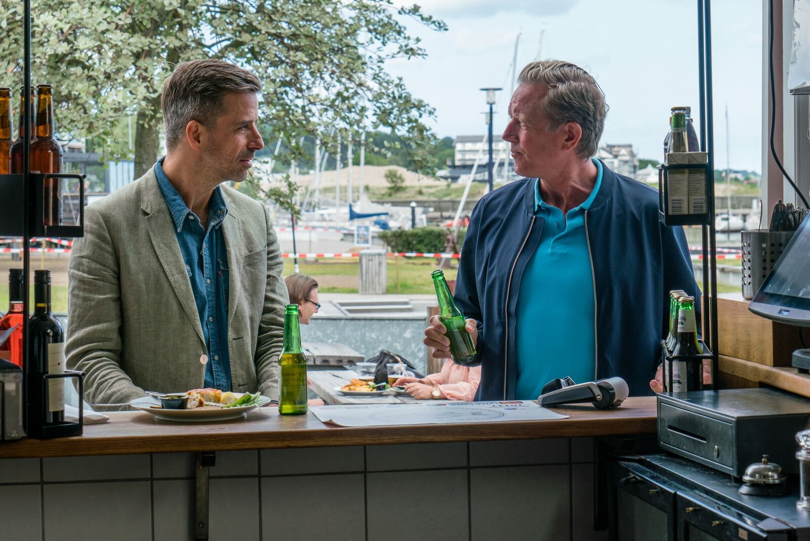 HeiratsschwindlerDan Sommerdahl (Peter Mygind, r.) und sein Freund und Kollege Flemming Torp (André Babikian) ermitteln gemeinsam in einem Mordfall in der Markthalle von Helsingør.Bild: © ZDF und Mike Kollöffel./Mike Kollöffel