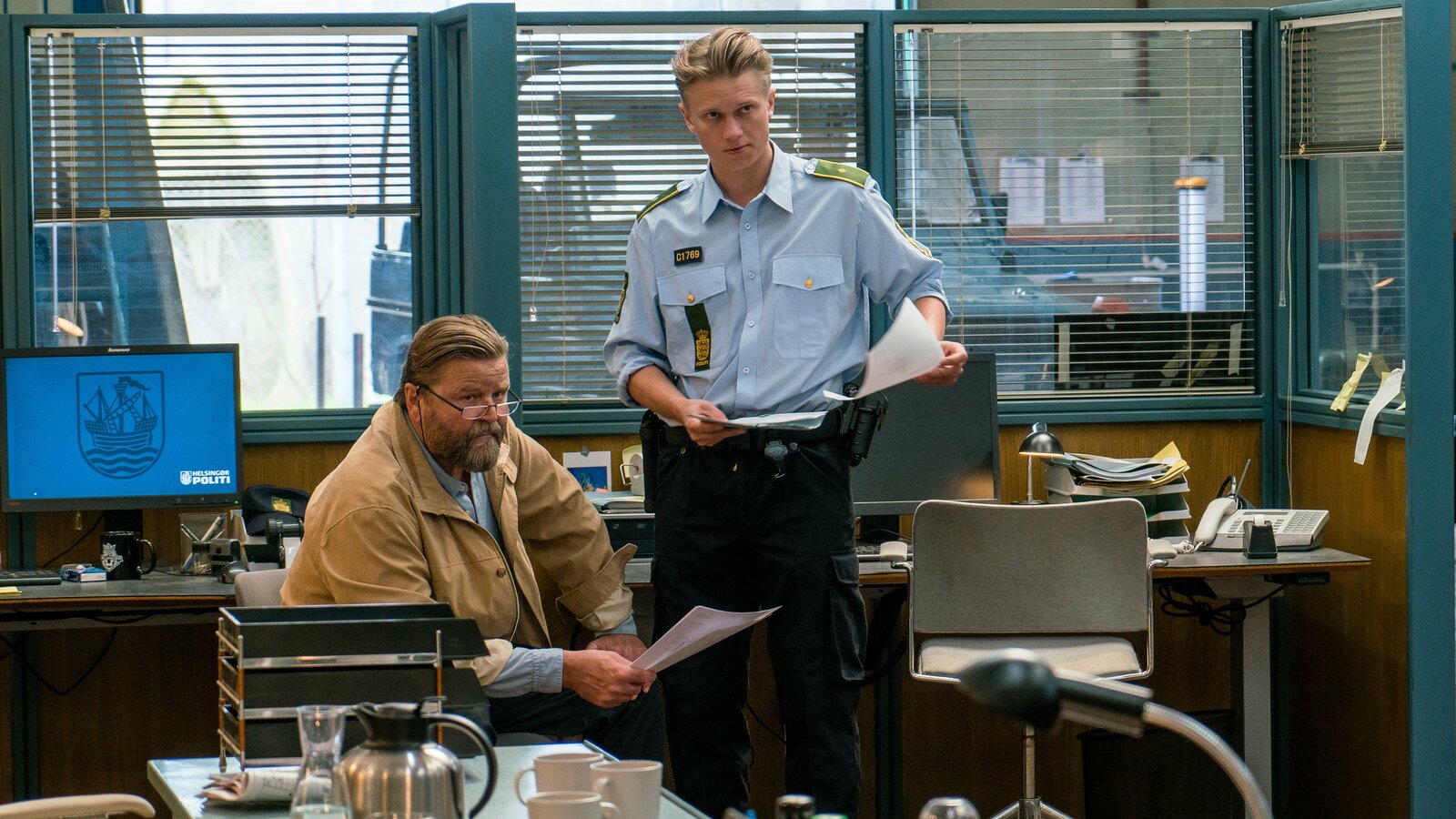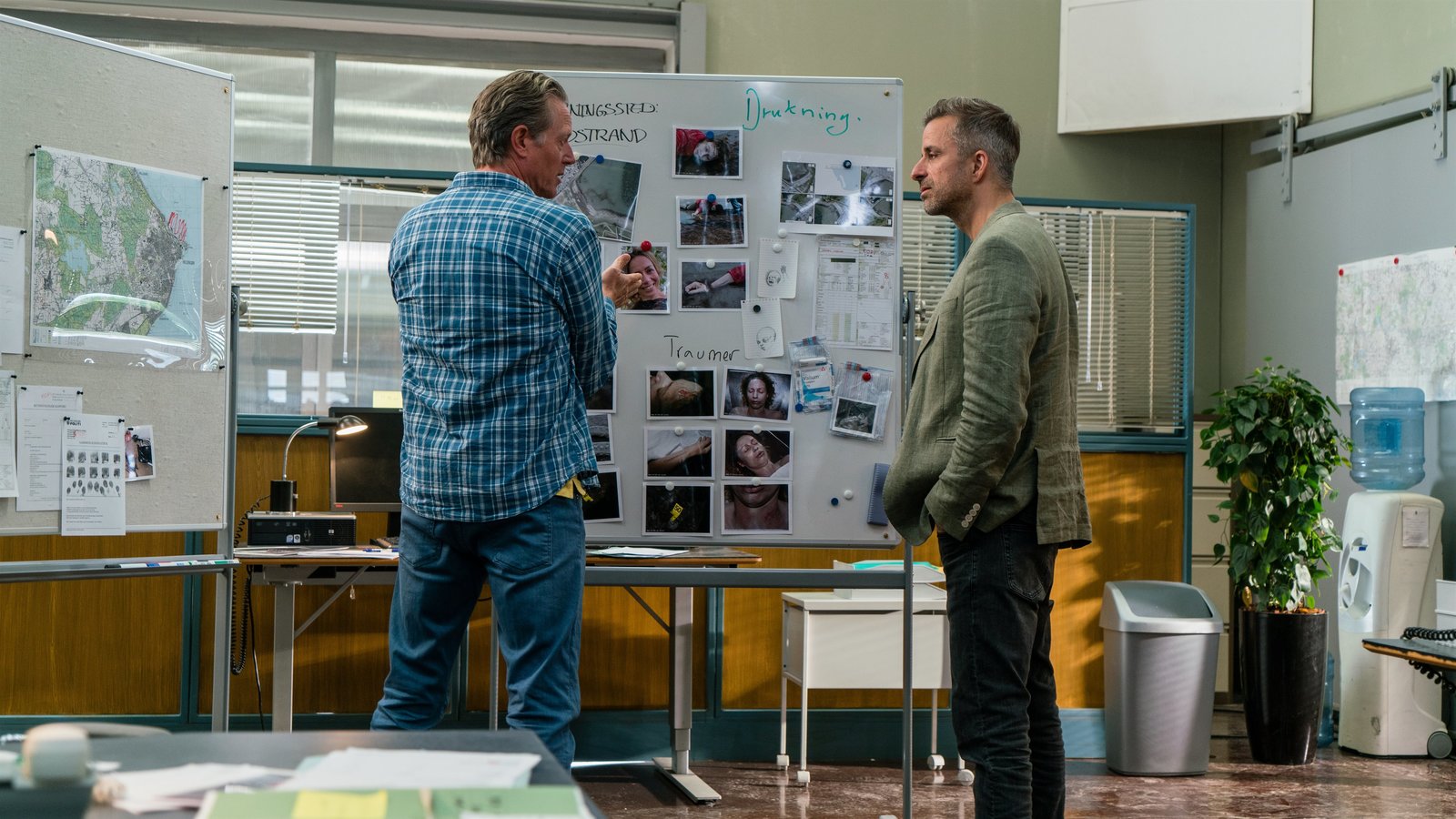 Die Tote am StrandDan Sommerdahl (Peter Mygind) und sein Kollege Flemming Torp (André Babikian) gehen noch einmal die Einzelheiten des Mordfalles in der Polizeistation durch.Bild: © ZDF und Mike Kollöffel./Mike Kollöffel