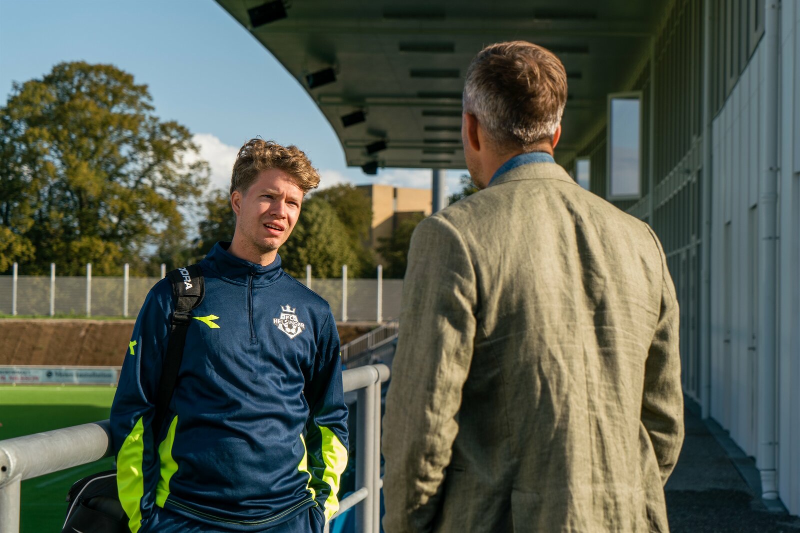 Mörderisches FoulPolizist Flemming (André Babikian) spricht mit Mitgliedern des Vereins und sucht nach Zeugen der Tat.Bild: © ZDF und Mike Kollöffel.