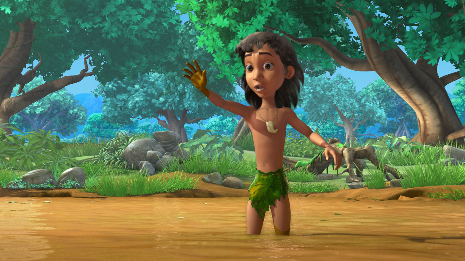 Mogli, das FestmahlBeim Plantschen wird Mogli (re.) von Jakala, dem Krokodil entführt.Bild: © ZDF/DQ Entertainment