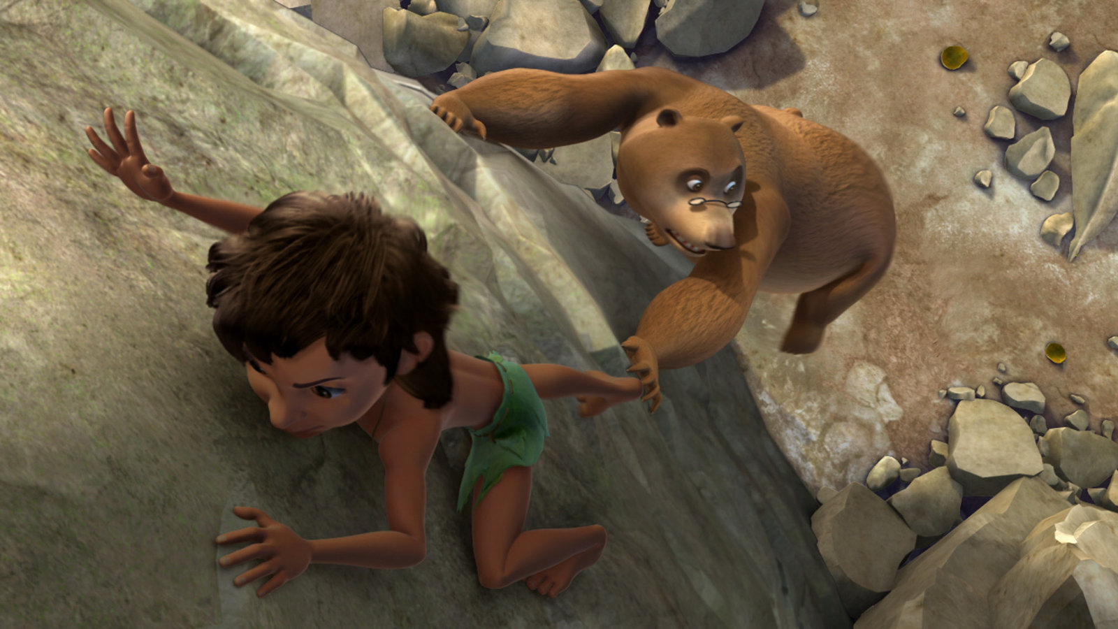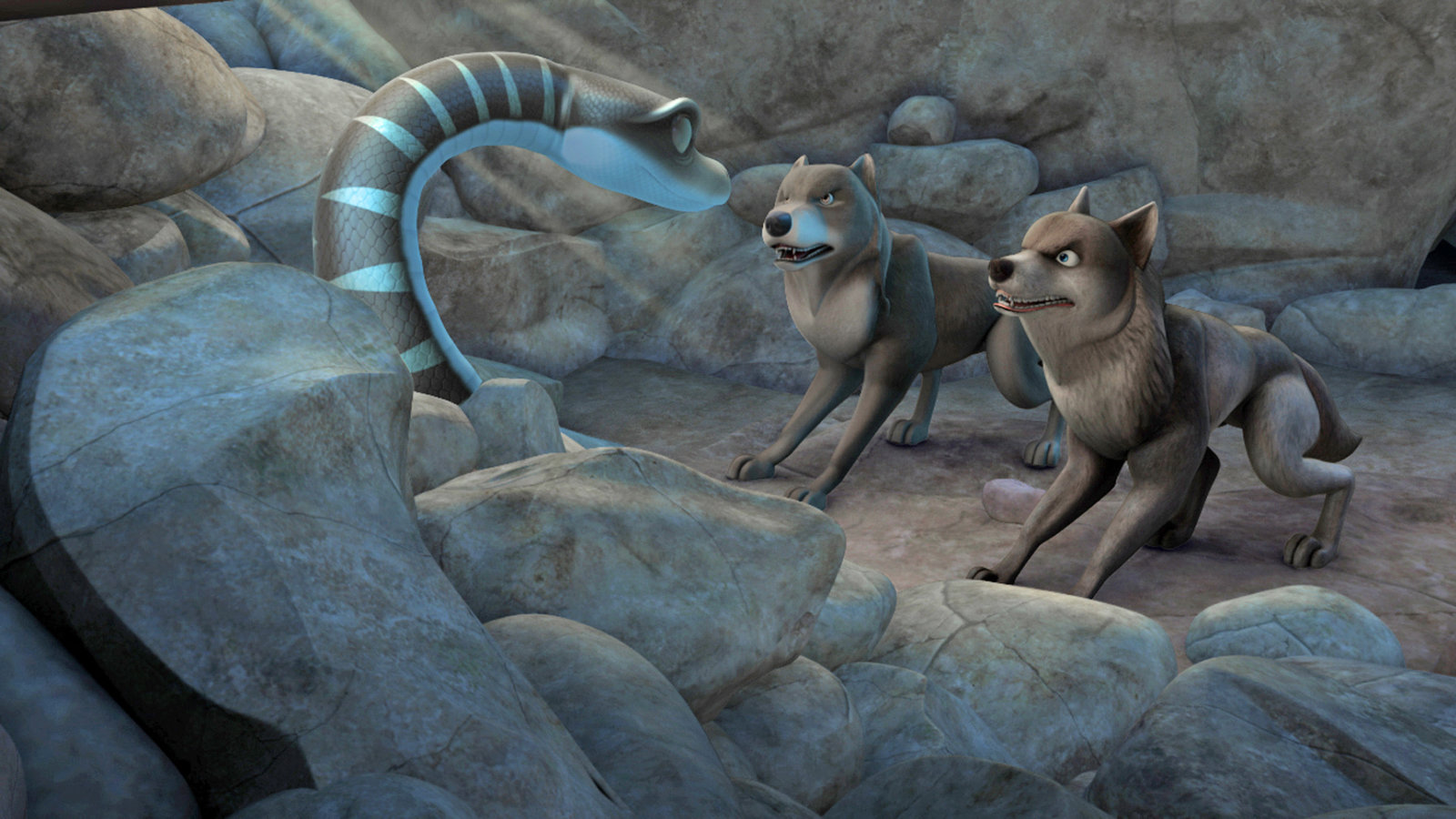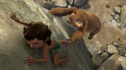 Das ErdbebenLali und Bala sind bei einem Erdbeben durch herunter fallende Steine in einer Höhle eingeschlossen worden. Nur Kaa, die Schlange, kann durch einen kleinen Spalt zu ihnen gelangen.Bild: © ZDF und DQ Entertainment