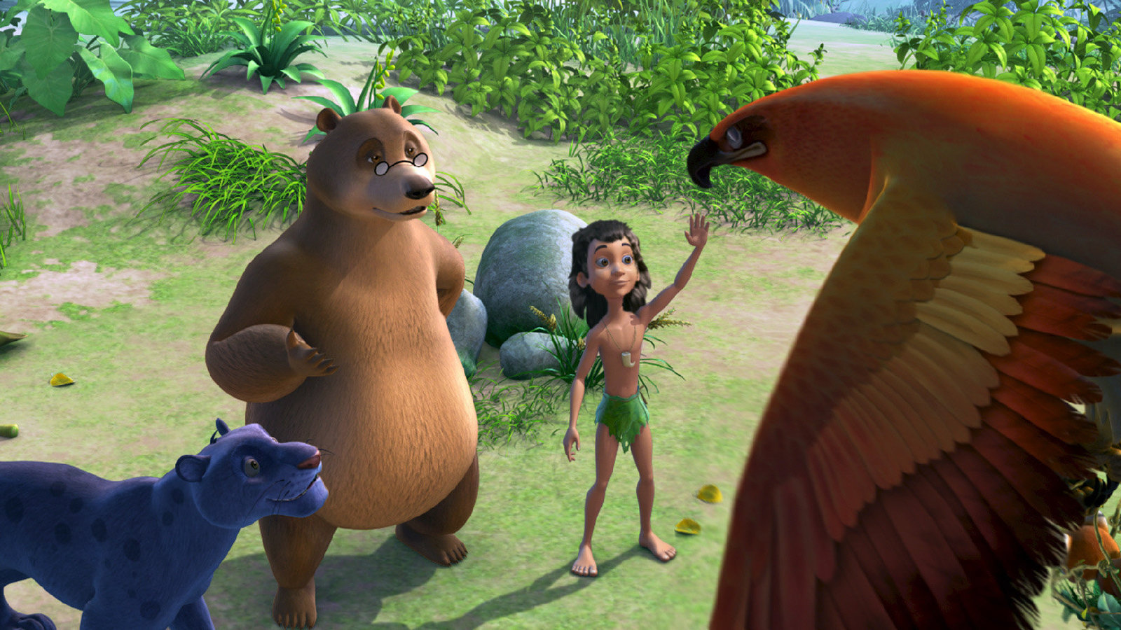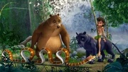Der weiße PfauBaghira und Mogli beobachten das Geturtel von Balu mit der fremden Bärin mit Unbehagen.Bild: © ZDF/DQ Entertainment