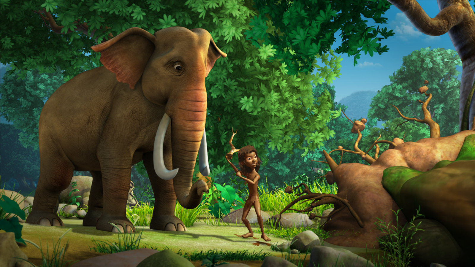 Mogli, das FestmahlHathi (l.) und Mogli (r.) wollen Jakala in die Flucht schlagen.Bild: © ZDF und DQ Entertainment