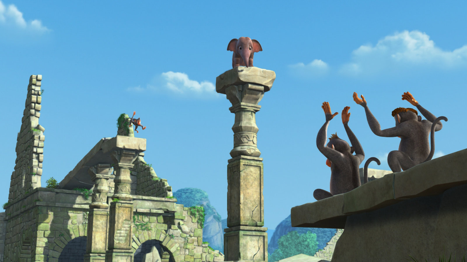Appu in GefahrAls der kleine Elefant Appu hoch oben in den Ruinen angekommen ist, bricht der Verbindungsweg hinter ihm zusammen. Er kann sich gerade noch auf eine Säule retten. Die frechen Affen finden das auch noch lustig...Bild: © ZDF und DQ Entertainment