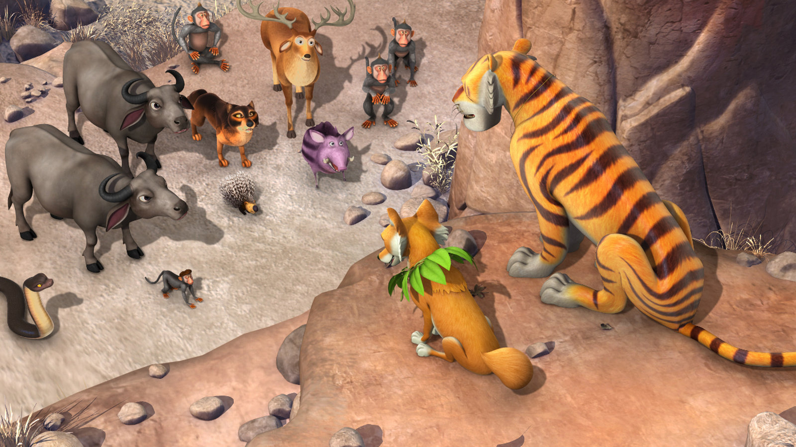 Die Bernstein-LegendeShir Khan (r.) hält sich durch den Bernstein für unbesiegbar. Er befiehlt den anderen Tieren, den Menschenjungen Mogli zu ihm zu bringen.Bild: © ZDF/DQ Entertainment