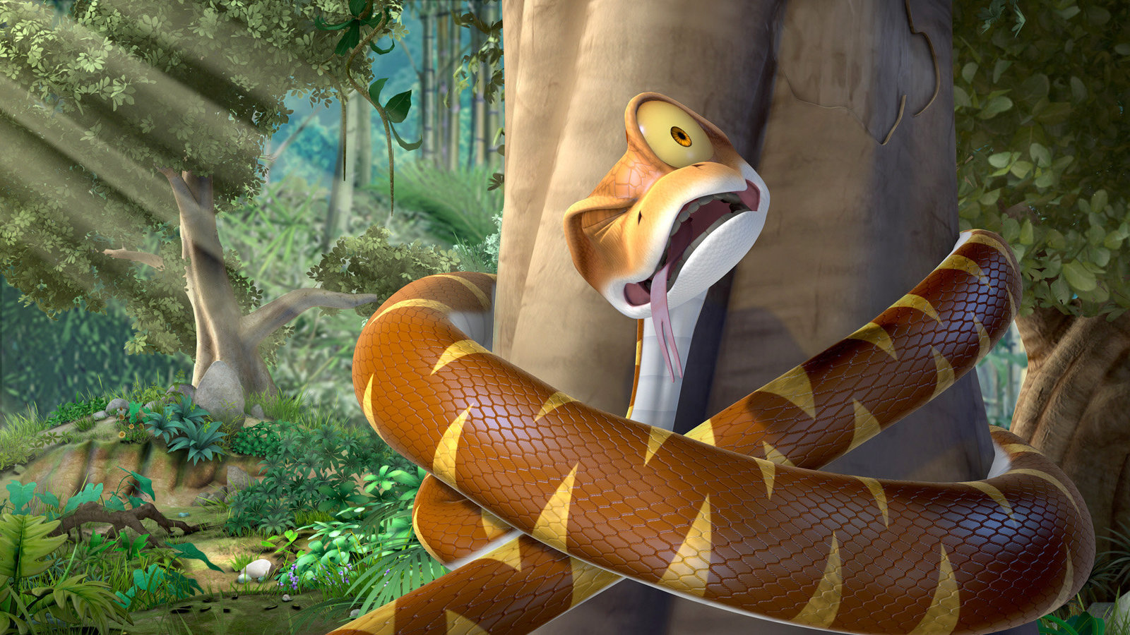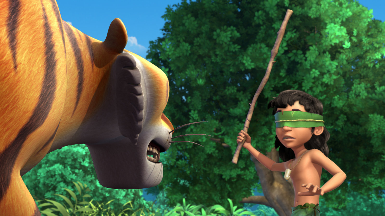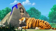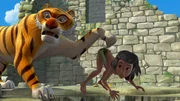 Vorübergehend blindWährend Baghira hinter Tabaqui her ist, hört Mogli (r.) den kleinen Vogel Darsi um Hilfe schreien. Was Mogli nicht weiß ist, dass Shir Khan (l.) die kleine Darsi zum Rufen zwingt.Bild: © ZDF und (c) DQ Entertainment