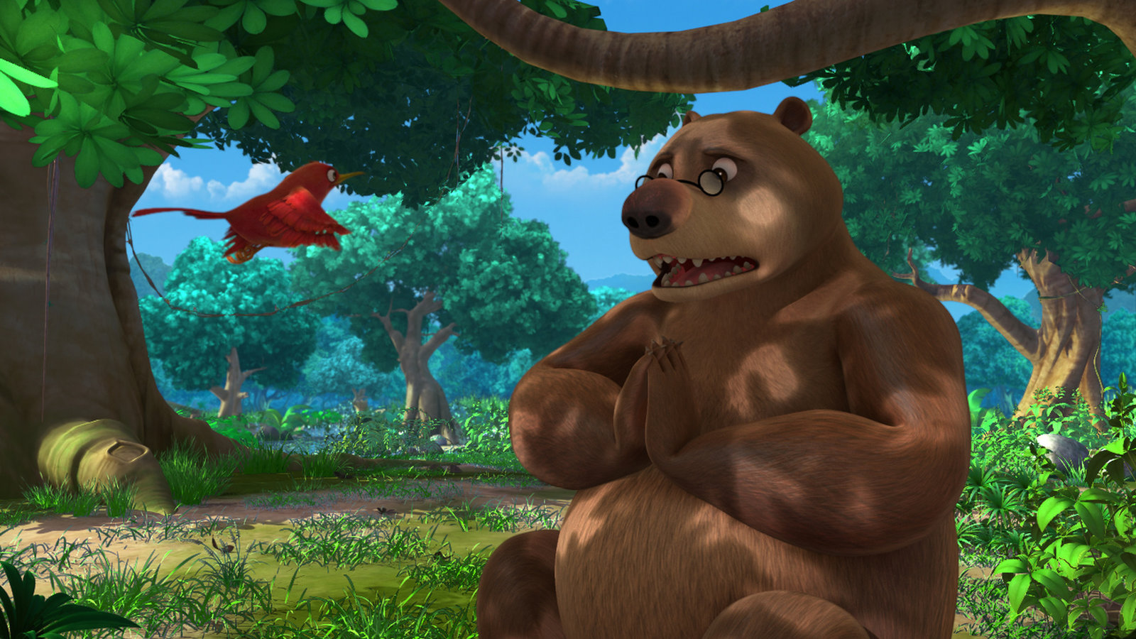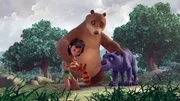 Honig für BaluBalu hat sich an der Nase verletzt und wartet auf Mogli und Baghira, die medizinischen Honig holen sind. Währenddessen will sich Darsi, der kleine vergessliche Vogel, um den leidenden Bären kümmern. Doch dabei geht einiges schief.Bild: © ZDF und DQ Entertainment