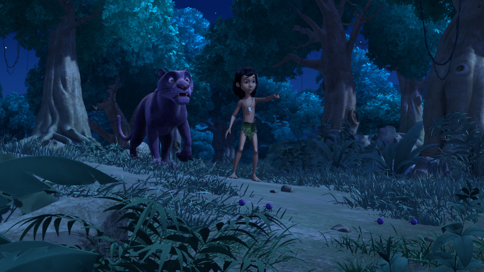 Wer ist der Dieb?Mogli (r.) und Baghira (l.) verfolgen den Dieb, der Ikkis Beeren gestohlen hat.Bild: © ZDF und (c) DQ Entertainment