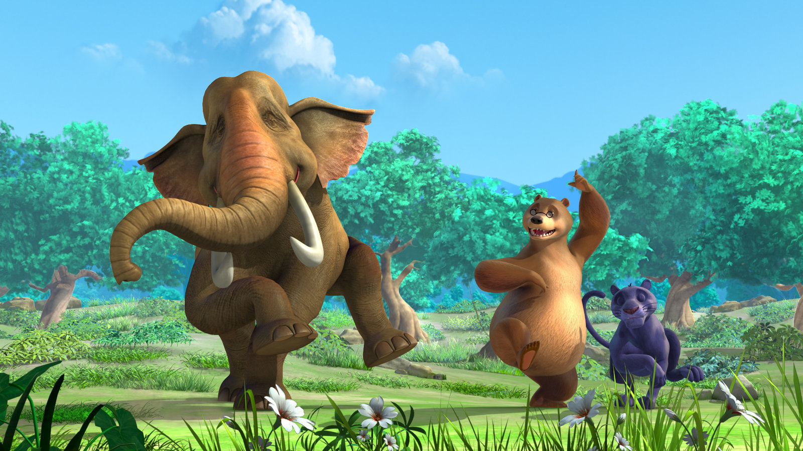 Aufruhr im UrwaldAuch Hathi, der Elefant, Balu und Baghira können nicht anders, als im Takt der tollen Dschungelmusik mitzuschwingen.Bild: © ZDF und DQ Entertainment