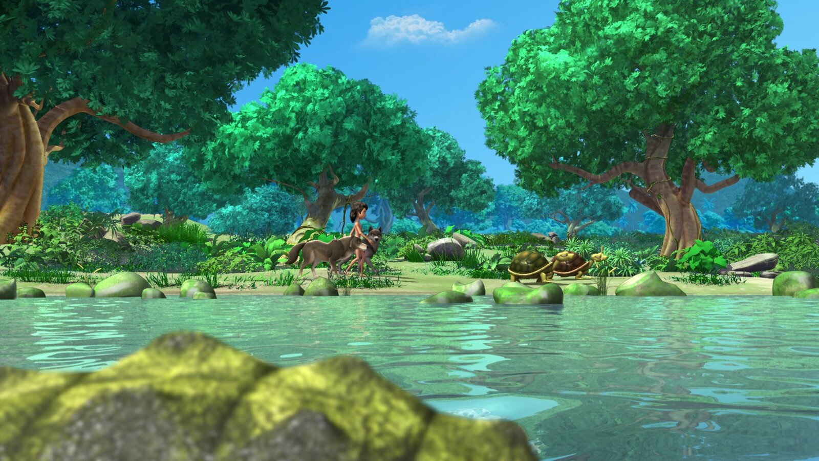 Auf zu den Baby-SchildkrötenMogli und seine beiden Wolfsgeschwister folgen den Schildkröten Uuh und Buh zu der Insel, auf der die Baby-Schildkröten schlüpfen werden.Bild: © ZDF und DQ Entertainment