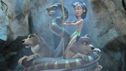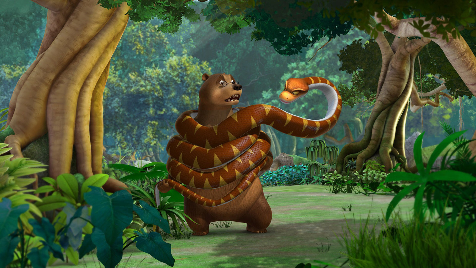 Wilde schwarze BienenDie Schlange Kaa ist überhaupt nicht erfreut darüber, dass Balu sie auf der Suche nach Mogli aufgeweckt hat.Bild: © ZDF/DQ Entertainment