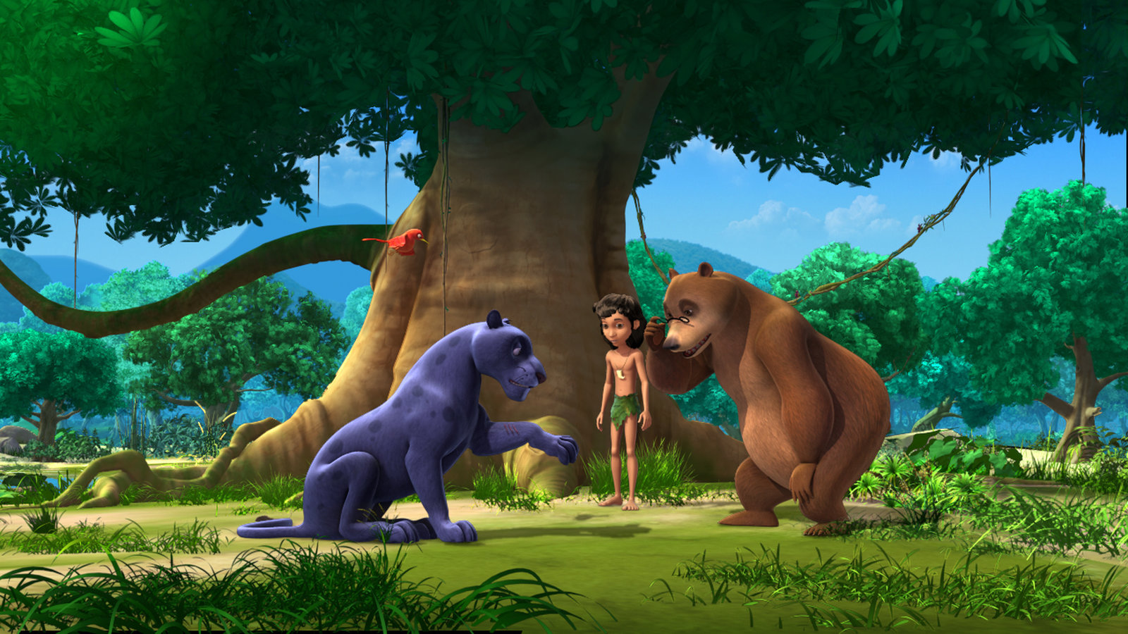 Baghira in NotBalu (re.) betrachtet sich Baghiras (li.) Wunde - die sieht gar nicht gut aus. Darsi (oben li.), das kleine Vögelchen, soll mit Mogli (Mi.) zusammen nach den schwarzen Maden im Tal des Nebels suchen.Bild: © ZDF/DQ Entertainment