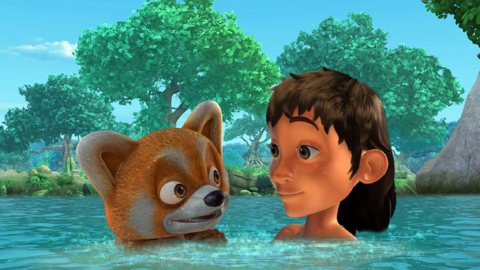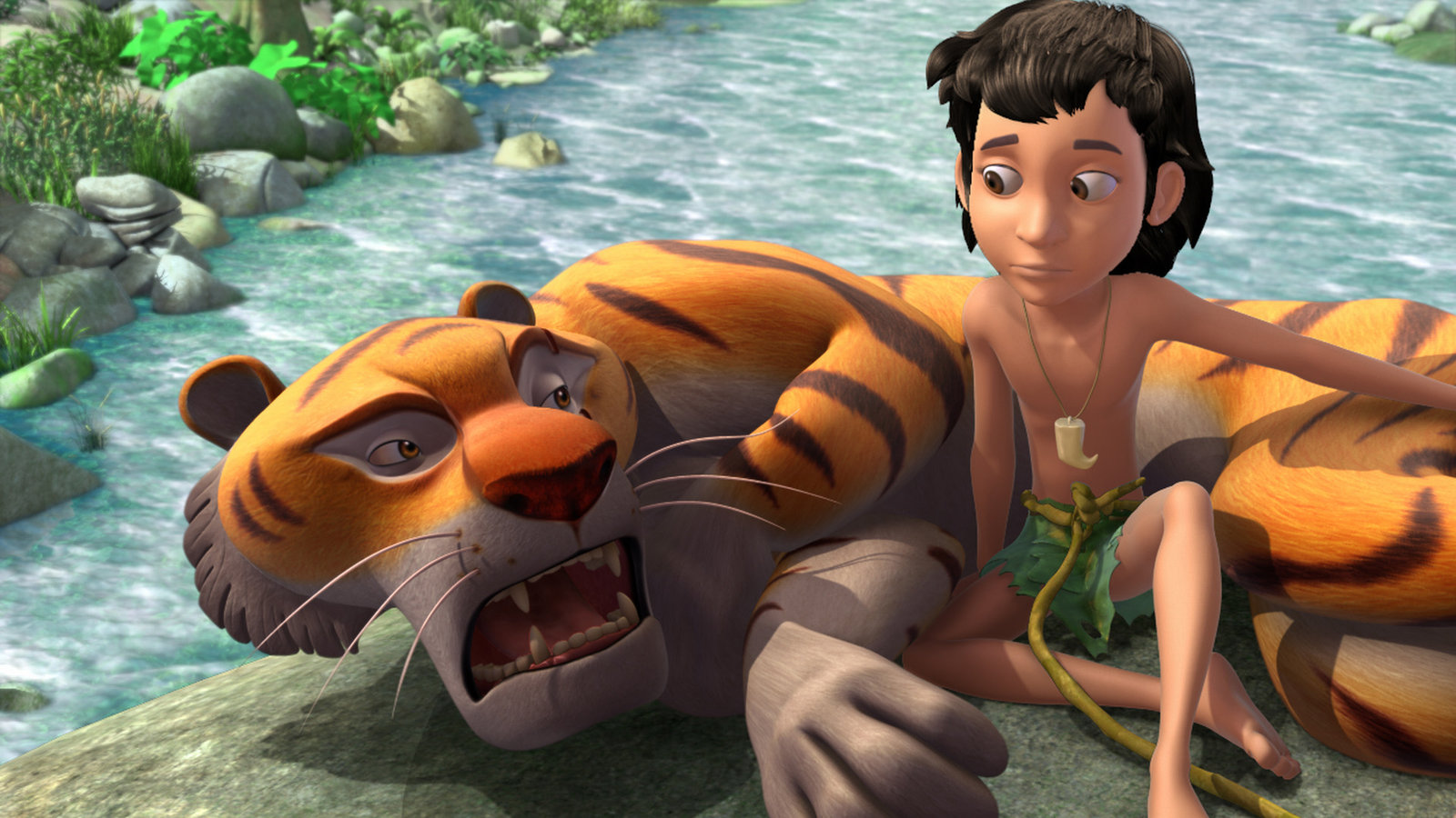 Dein Feind und HelferShir Khan wundert sich: Warum will denn der Menschenjunge ihm helfen von dem Felsen mitten im Wasserfall wegzukommen?Bild: © ZDF/DQ Entertainment