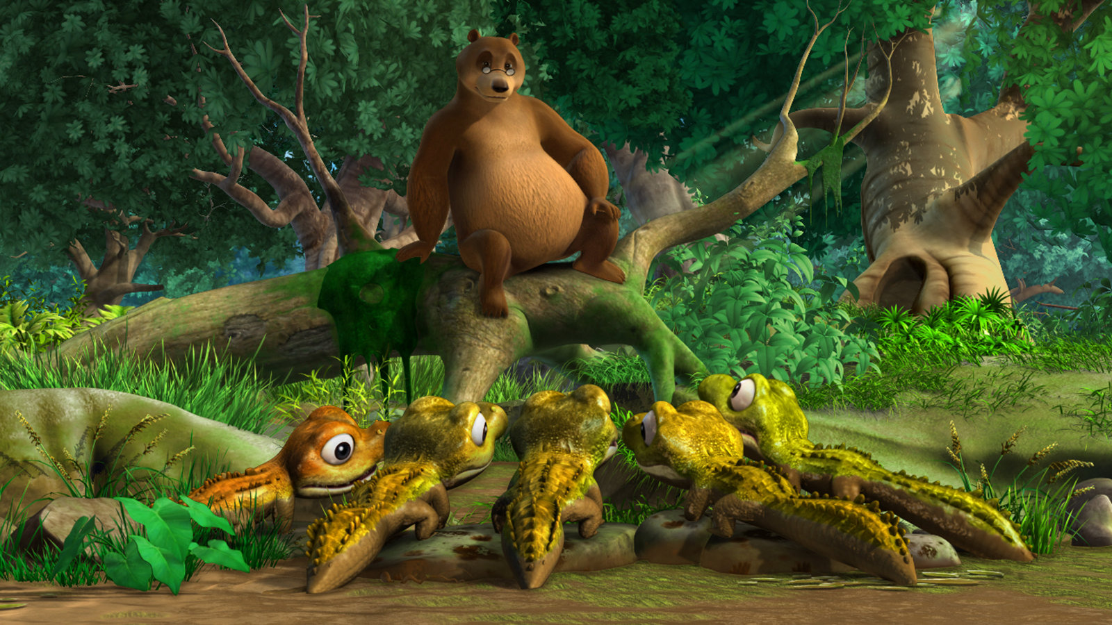 Die DschungelprüfungDie fünf jungen Krokodile sind von Balus spannender Geschichte begeistert.Bild: © ZDF/DQ Entertainment