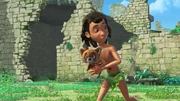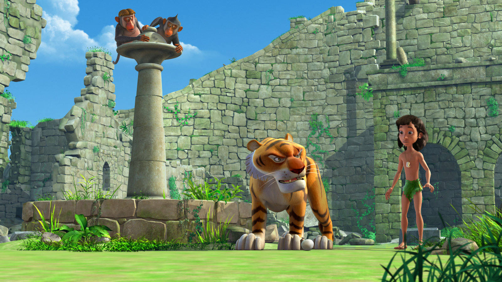 Gefährliches SpielPlötzlich taucht Shir Khan auf. Während die Affen das Weite suchen, fordert Mogli den Tiger zu einem Ballwurf-Wettkampf auf.Bild: © ZDF/ZDF/DQ Entertainment