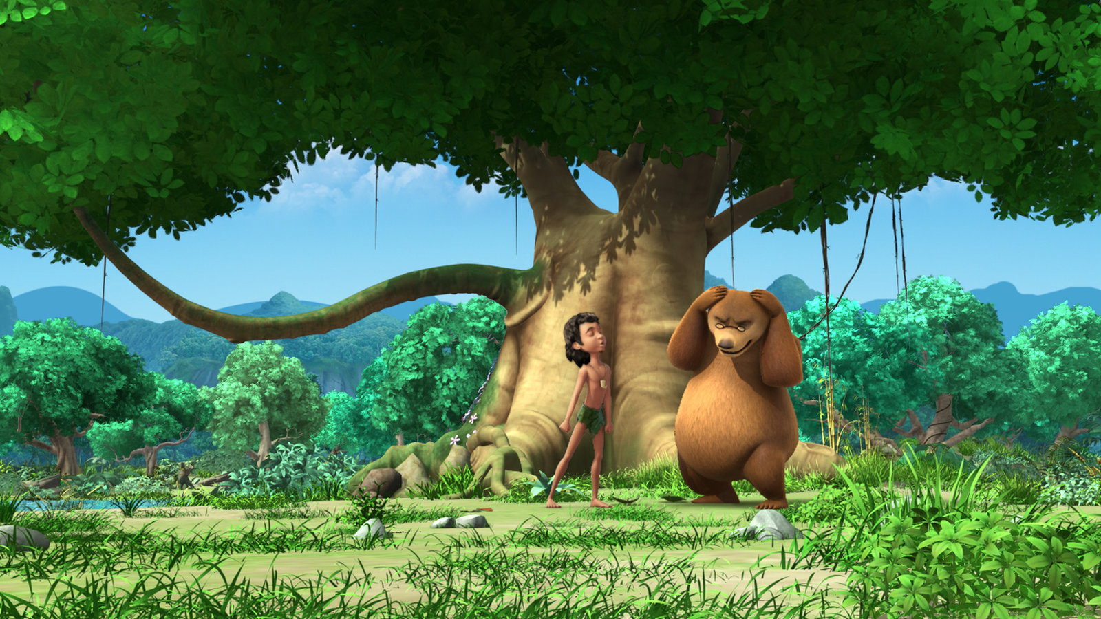 Das Heulen der WölfeMogli (l.) übt, wie ein Wolf zu heulen. Doch es hört sich nicht wirklich gut an. Er sucht Rat bei seinem Freund Balu (r.).Bild: © ZDF und (c) DQ Entertainment