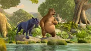 Gefahr am WasserfallVom Ufer aus entdecken Baghira und Balu ihren Freund Mogli, der auf einem Ast Richtung Wasserfall treibt.Bild: © ORF