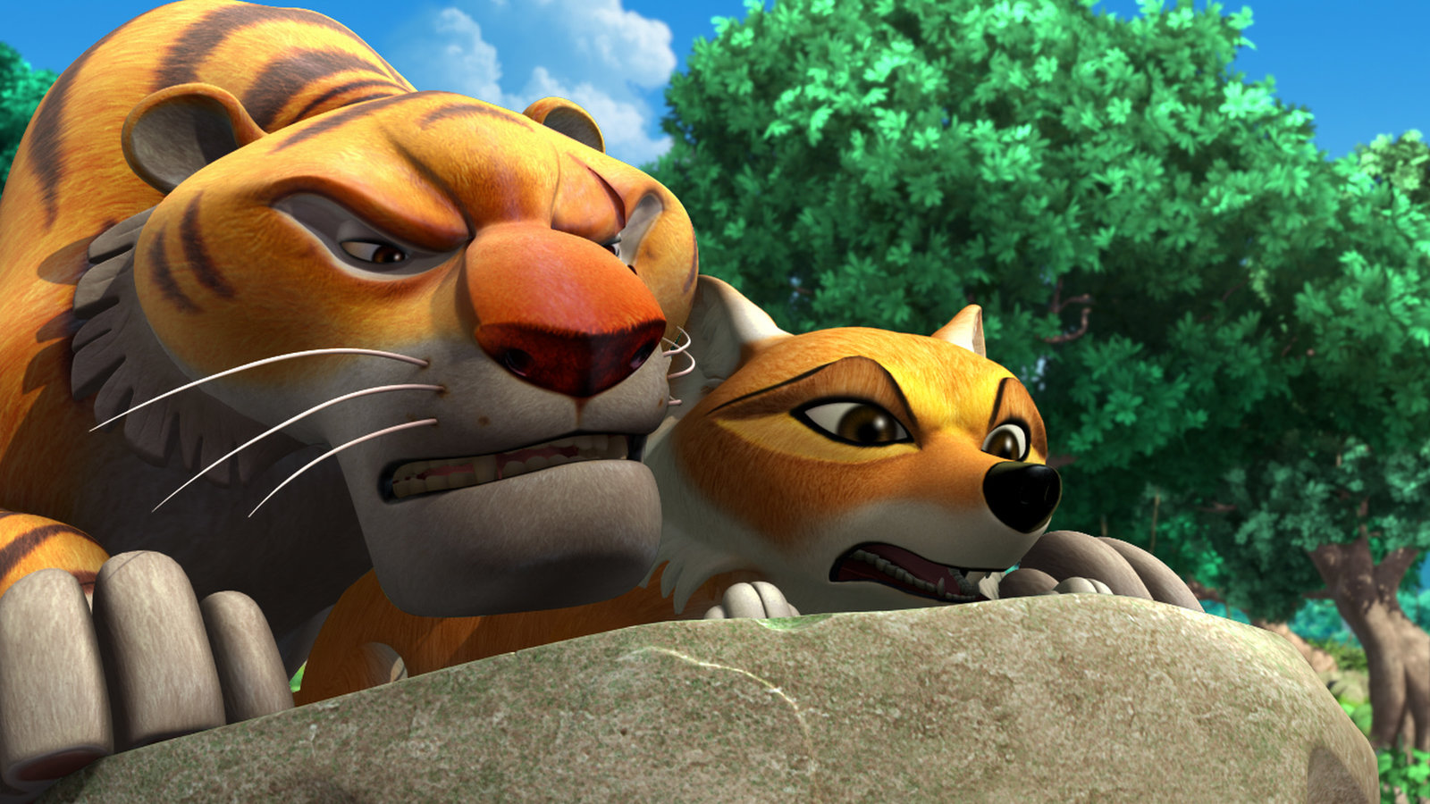 Tabaquis fast perfekter PlanShir Khan (l.) und Tabaqui (r.) beobachten, wie Mogli und die Tiere zum Unterschlupf gehen. Wie können sie verhindern, dass Mogli mit in das sichere Versteck geht?Bild: © ZDF und (c) DQ Entertainment