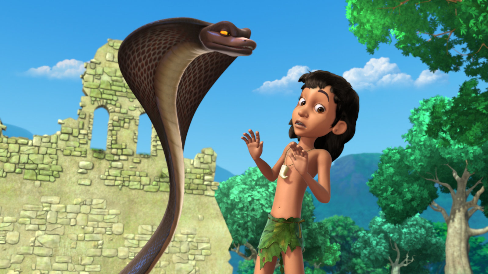 Jagd nach dem SmaragdDie Kobra Thu (l.) beauftragt Mogli (r.), den Smaragd wiederzuholen. Er muss den dicken Vogel Rangu verfolgen, denn der hat sich die Mango samt Smaragd gekrallt und ist damit weggeflogen.Bild: © ZDF und (c) DQ Entertainment