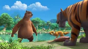 Balus SchatzTabaqui (M.) beobachtet neugierig, wie sich Balu (l.) und Shir Khan (r.) um einen Fisch streiten. Balu wird mächtig sauer, als Shir Khan ihm sagt, dass er schon immer seine Schätze an ihn verloren habe.Bild: © ZDF und (c) DQ Entertainment