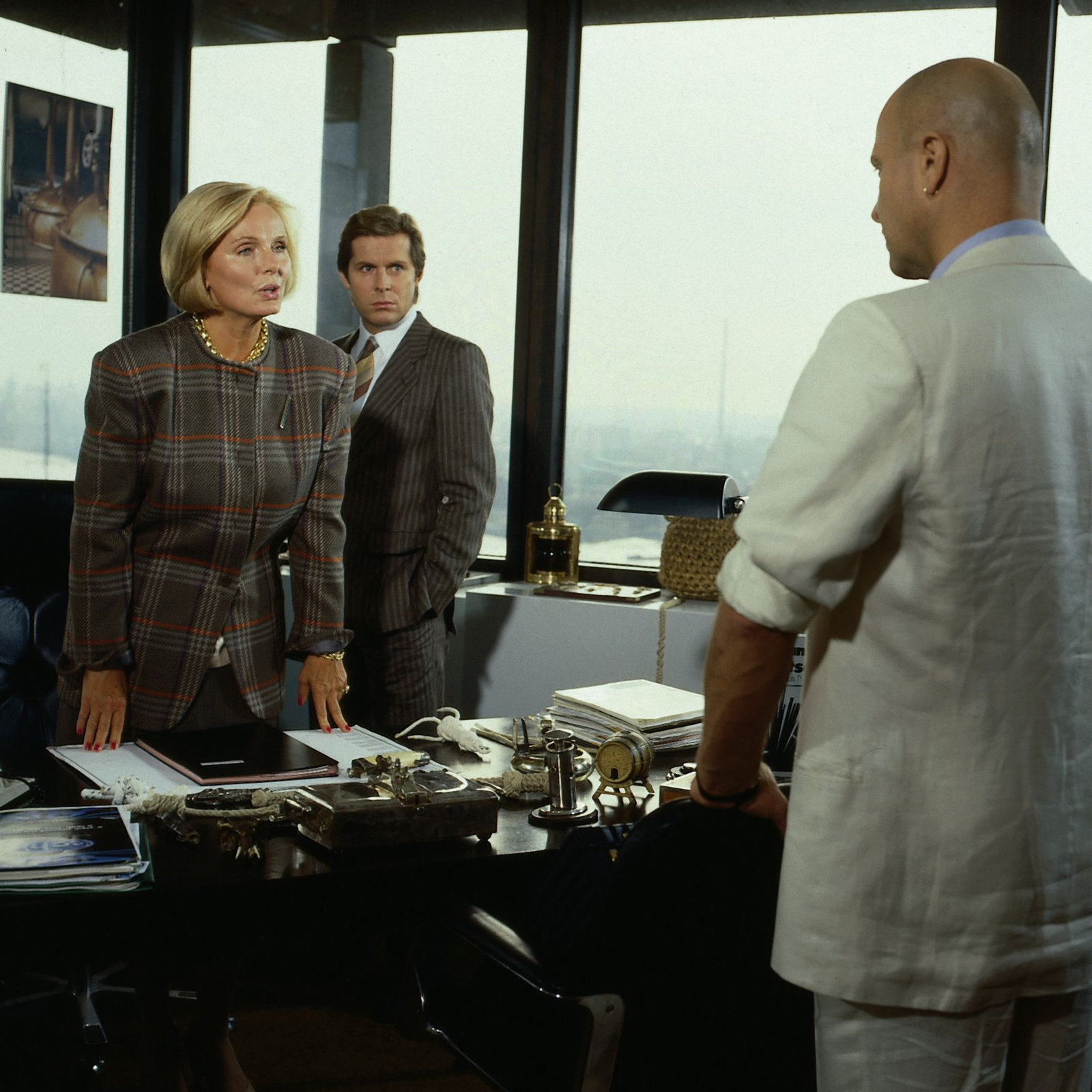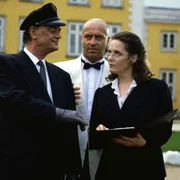 Die goldene Kette - Teil 118. Zur Geburtagsfeier sind die ersten Gäste eingetroffen. Frau Reinders, die Sekretärin des Chefs (Astrid Meyer-Gossler) geht mit Chauffeur Kröger (Friedrich Schütter, li.) die Gästeliste durch, beobachtet von Achim Lauritzen (Wilfried Baasner, Mi.).Bild: © ZDF und NDF