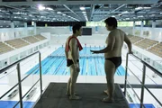 Radu (Robert Alexander Baer, l.) und Flori (Frithjof Gawenda, r.) stehen im Schwimmbad auf dem Zehn-Meter-Turm.Bild: © ZDF und Dennis Pauls