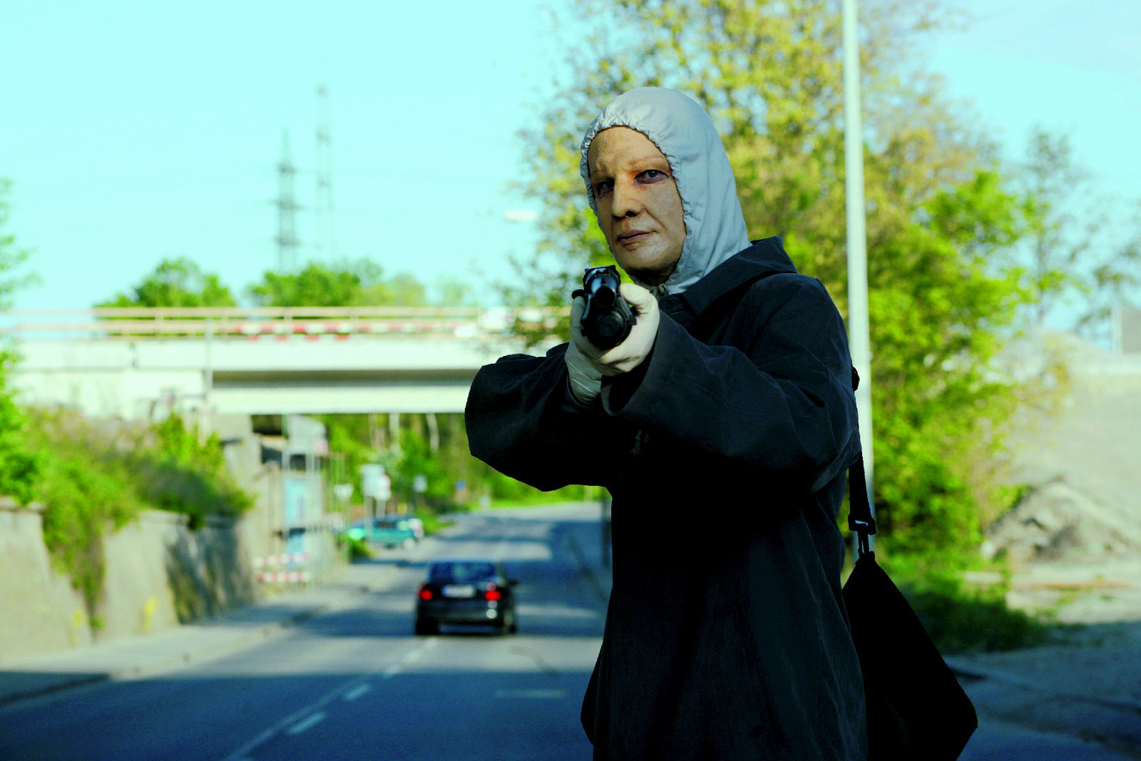 Ein Fluchtauto muss beschafft werden. Johann Rettenberger (Andreas Lust) tarnt sich bei allen Raubzügen mit einer Maske.Bild: © ZDF und Petro Domenigg