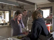 Vater Reschke (Sven Lehmann, M.) verfolgt argwöhnisch die zarte Liebesgeschichte zwischen Marie (Luise Berndt, l.) und Lars (Constantin von Jascheroff, r.)Bild: © ZDF und Roland Schütz